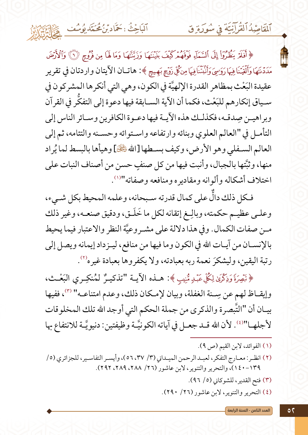 (¬٢). انظر: معارج التفكر، لعبد الرحمن الميداني (٣/ ٣٧، ٥٦)، وأيسر التفاسير، للجزائري (٥/ ١٣٩ - ١٤٠)، والتحرير والتنوير، لابن عاشور (٢٦/ ٢٨٨، ٢٨٩، ٢٩٢).