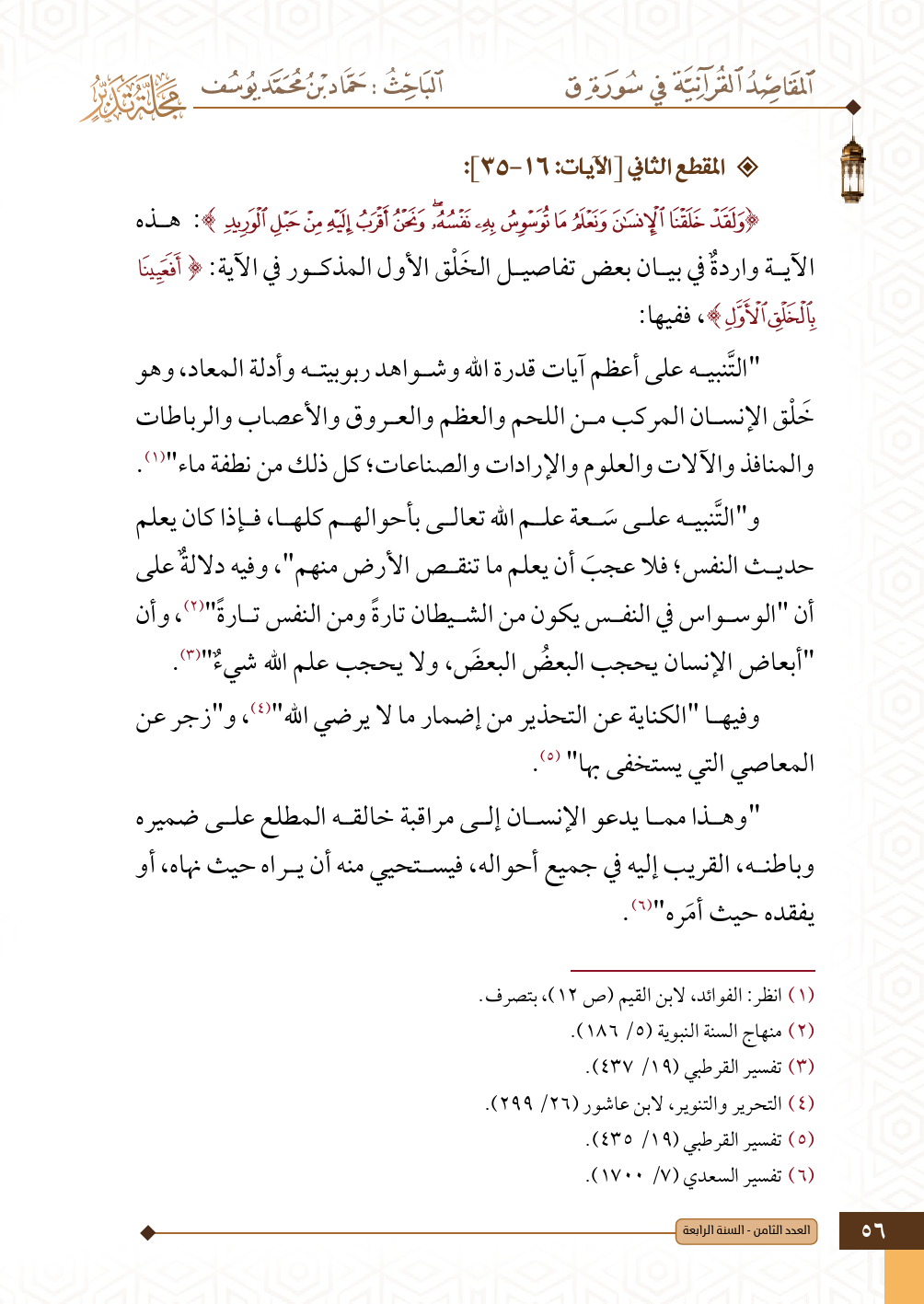 {وَلَقَدْ خَلَقْنَا الْإِنْسَانَ وَنَعْلَمُ مَا تُوَسْوِسُ بِهِ نَفْسُهُ وَنَحْنُ أَقْرَبُ إِلَيْهِ مِنْ حَبْلِ الْوَرِيدِ}: هذه الآية واردةٌ في بيان بعض تفاصيل الخَلْق الأول المذكور في الآية: {أَفَعَيِينَا بِالْخَلْقِ الْأَوَّلِ}، ففيها: