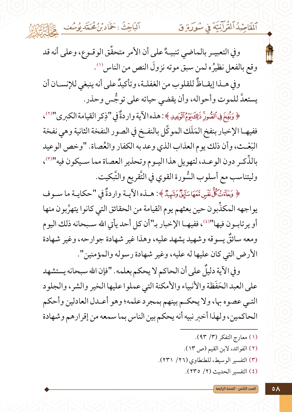 {وَنُفِخَ فِي الصُّورِ ذَلِكَ يَوْمُ الْوَعِيدِ}: هذه الآية واردةٌ في "ذِكر القيامة الكبرى" (¬٢)، ففيها الإخبار بنفخ المَلَك الموكَّل بالنفخ في الصور النفخة الثانية وهي نفخة البَعْث، وأن ذلك يوم العذاب الذي وعد به الكفار والعُصاة. "وخص الوعيد بالذِّكر دون الوعد، لتهويل هذا اليوم وتحذير العصاة مما سيكون فيه" (¬٣)، وليتناسب مع أسلوب السُّورة القوي في التَّقريع والتَّبكيت.