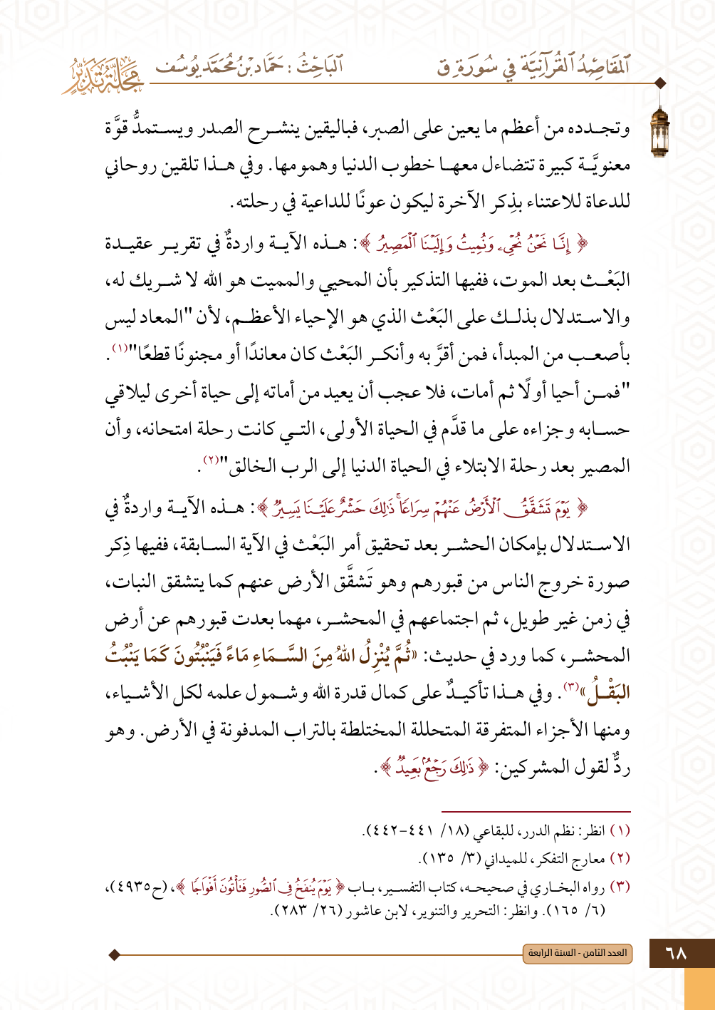 (¬٣). رواه البخاري في صحيحه، كتاب التفسير، باب {يَوْمَ يُنْفَخُ فِي الصُّورِ فَتَأْتُونَ أَفْوَاجًا}، (ح ٤٩٣٥)، (٦/ ١٦٥). وانظر: التحرير والتنوير، لابن عاشور (٢٦/ ٢٨٣).