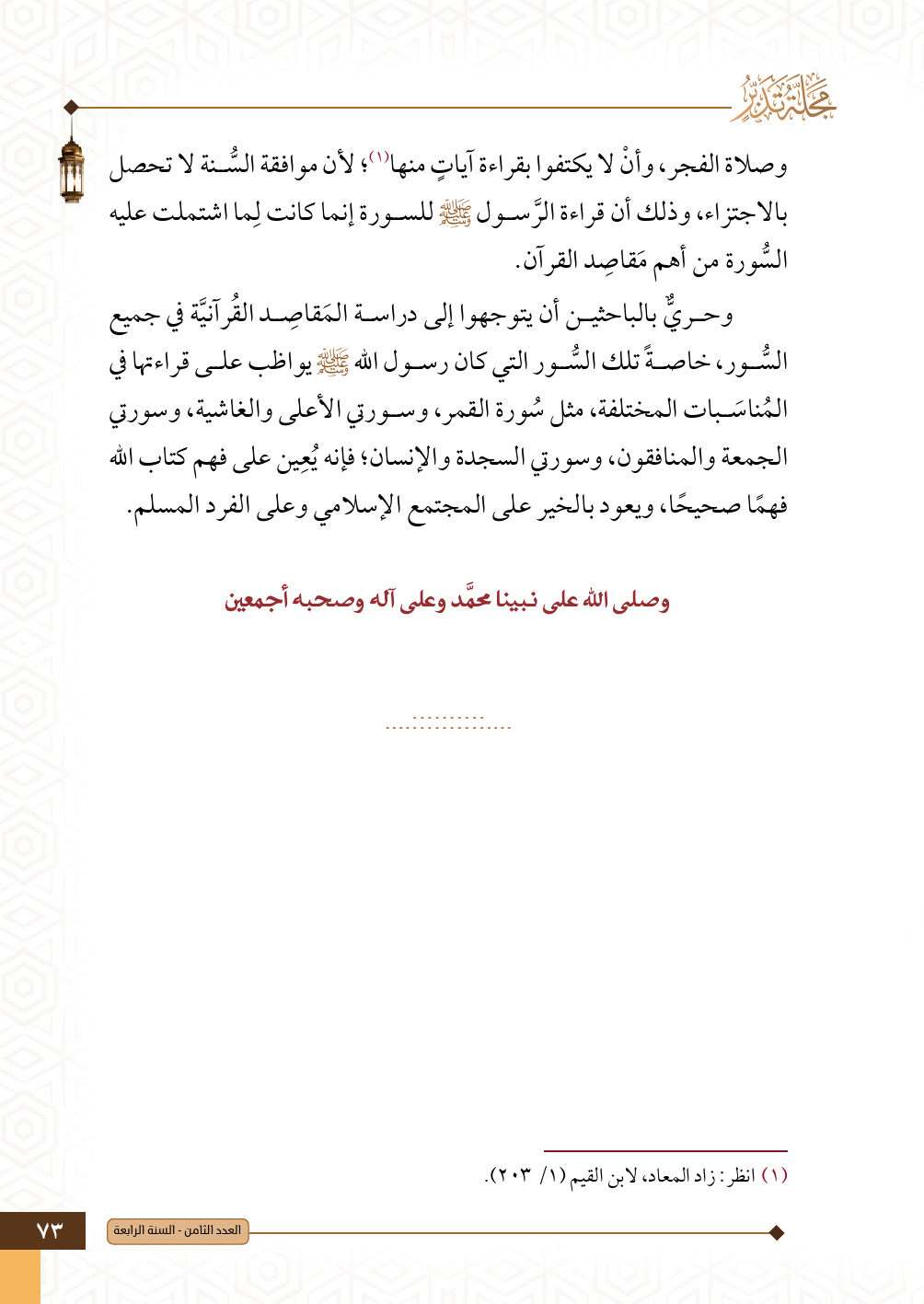 وحريٌّ بالباحثين أن يتوجهوا إلى دراسة المَقاصِد القُرآنيَّة في جميع السُّور، خاصةً تلك السُّور التي كان رسول الله - صلى الله عليه وسلم - يواظب على قراءتها في المُناسَبات المختلفة، مثل سُورة القمر، وسورتي الأعلى والغاشية، وسورتي الجمعة والمنافقون، وسورتي السجدة والإنسان؛ فإنه يُعِين على فهم كتاب الله فهمًا صحيحًا، ويعود بالخير على المجتمع الإسلامي وعلى الفرد المسلم.