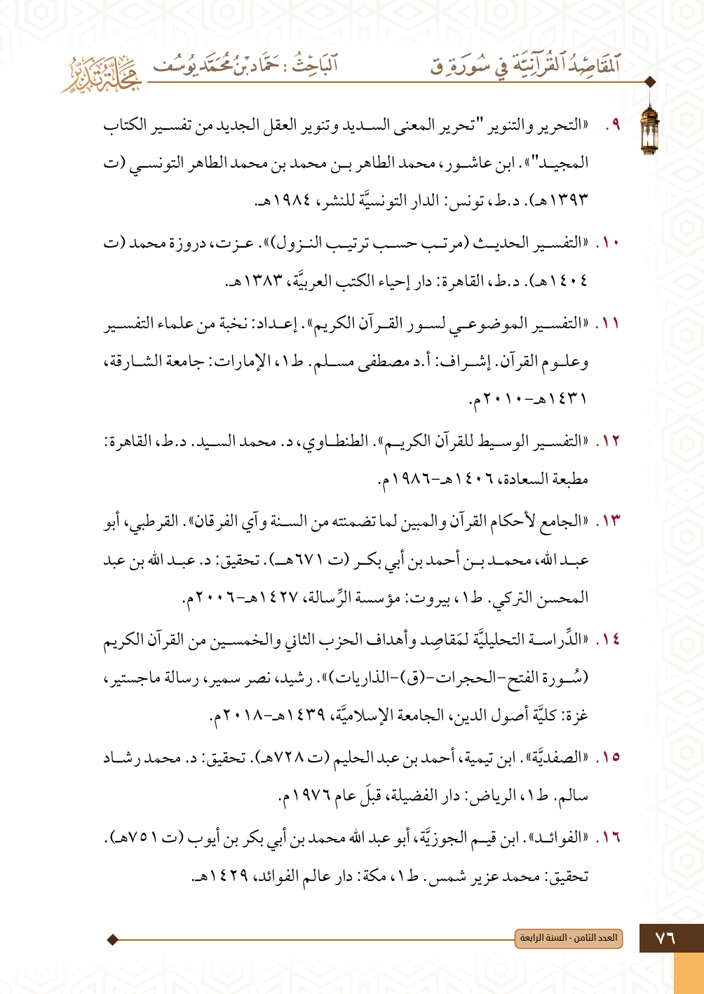٩. «التحرير والتنوير "تحرير المعنى السديد وتنوير العقل الجديد من تفسير الكتاب المجيد"». ابن عاشور، محمد الطاهر بن محمد بن محمد الطاهر التونسي (ت ١٣٩٣ هـ). د. ط، تونس: الدار التونسيَّة للنشر، ١٩٨٤ هـ.