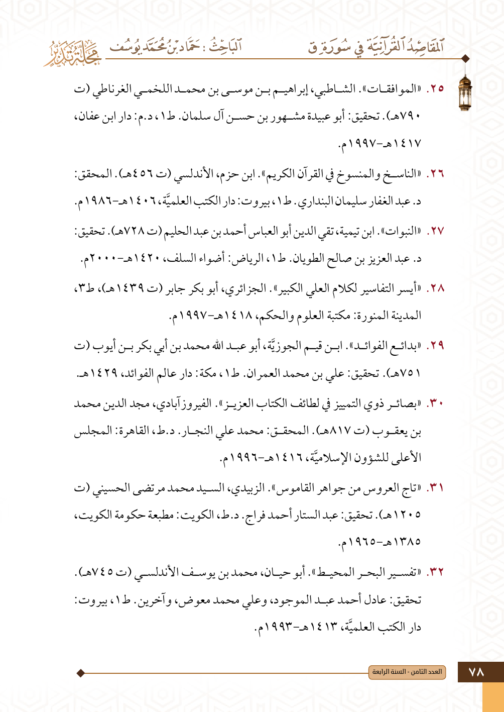 ٣٠. «بصائر ذوي التمييز في لطائف الكتاب العزيز». الفيروزآبادي، مجد الدين محمد بن يعقوب (ت ٨١٧ هـ). المحقق: محمد علي النجار. د. ط، القاهرة: المجلس الأعلى للشؤون الإسلاميَّة، ١٤١٦ هـ-١٩٩٦ م.