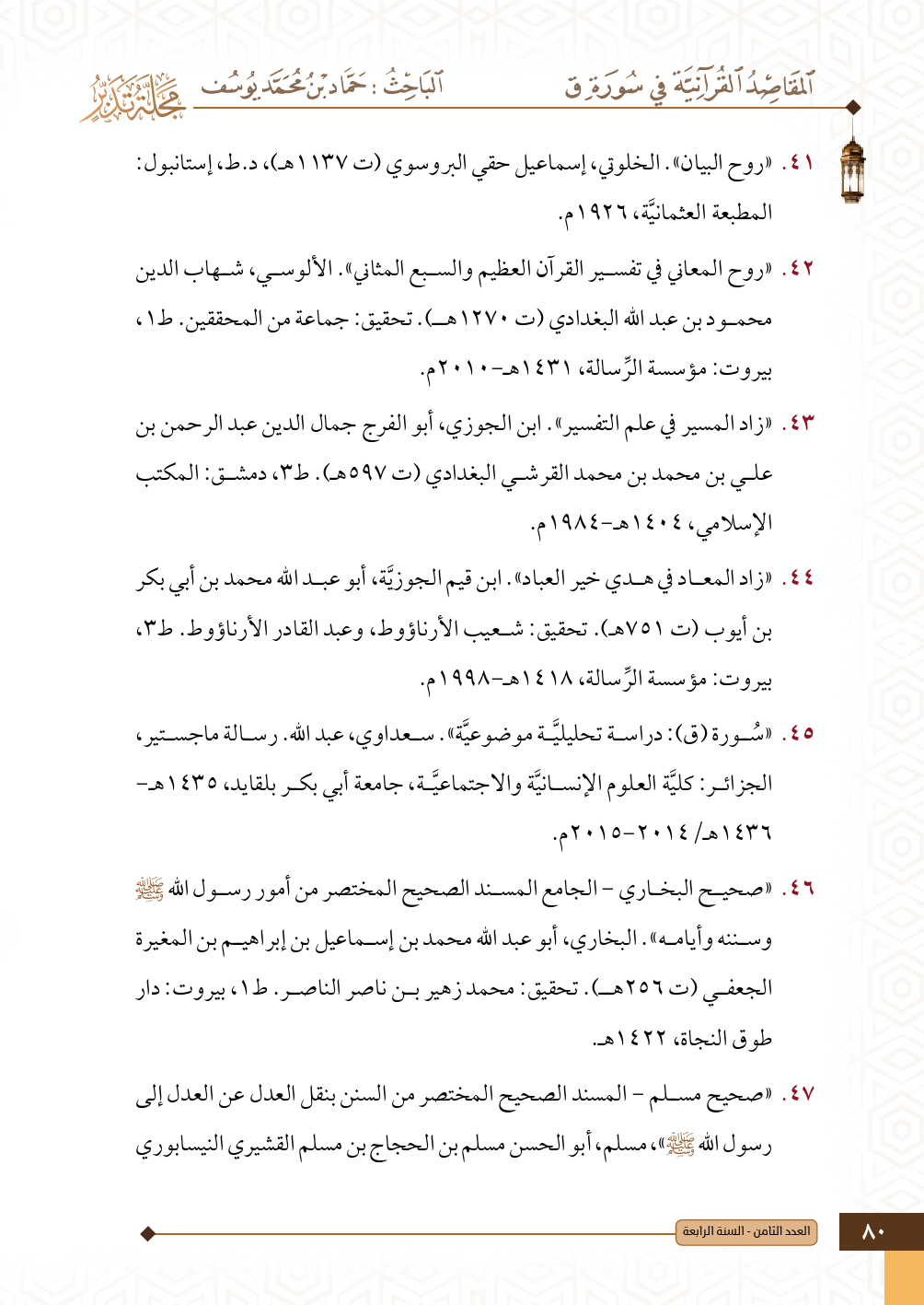 ٤٥. «سُورة (ق): دراسة تحليليَّة موضوعيَّة». سعداوي، عبد الله. رسالة ماجستير، الجزائر: كليَّة العلوم الإنسانيَّة والاجتماعيَّة، جامعة أبي بكر بلقايد، ١٤٣٥ هـ-١٤٣٦ هـ/٢٠١٤ - ٢٠١٥ م.