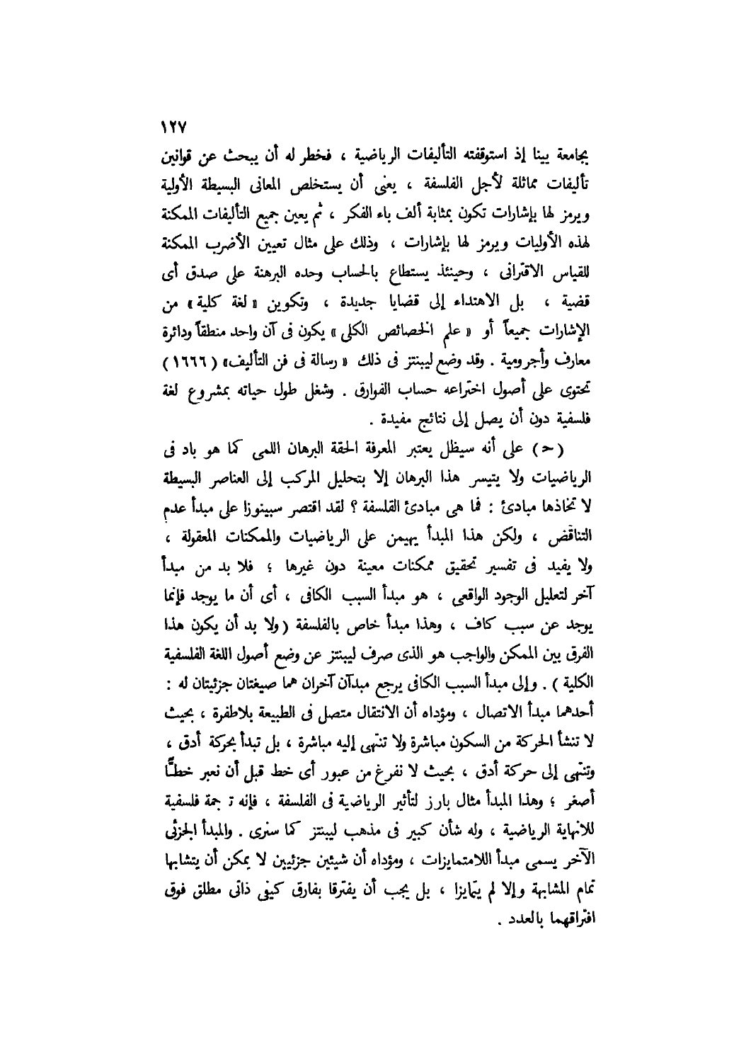 ج- على أنه سيظل يعتبر المعرفة الحقة البرهان اللمي كما هو بادٍ في الرياضيات, ولا يتيسر هذا البرهان إلا بتحليل المركب إلى العناصر البسيطة لاتخاذها مبادئ, فما هي مبادئ الفلسفة؟ لقد اقتصر سبينوزا على مبدأ عدم التناقض، ولكن هذا المبدأ يهيمن على الرياضيات والممكنات المعقولة، ولا يفيد في تفسير تحقيق ممكنات معينة دون غيرها؛ فلا بد من مبدأ آخر لتعليل الوجود الواقعي، هو مبدأ السبب الكافي، أي: إن ما يوجد فإنما يوجد عن سبب كافٍ، وهذا مبدأ خاص بالفلسفة "ولا بد أن يكون هذا الفرق بين الممكن والواجب هو الذي صرف ليبنتز عن وضع أصول اللغة الفلسفية الكلية". وإلى مبدأ السبب الكافي يرجع مبدآن آخران هما صيغتان جزئيتان له: أحدهما مبدأ الاتصال، ومؤداه أن الانتقال متصل في الطبيعة بلا طفرة، بحيث لا تنشأ الحركة من السكون مباشرة ولا تنتهي إليه مباشرة، بل تبدأ بحركة أدق، وتنتهي إلى حركة أدق، بحيث لا نفرغ من عبور أي خط قبل أن نعبر خطا أصغر، وهذا المبدأ مثال بارز لتأثير الرياضية في الفلسفة، فإنه ترجمة فلسفية للانهاية الرياضية، وله شأن كبير في مذهب ليبنتز كما سنرى، والمبدأ الجزئي الآخر يسمى مبدأ اللامتمايزات، ومؤداه أن شيئين جزئيين لا يمكن أن يتشابها تمام المشابهة وإلا لم يتمايزا، بل يجب أن يفترقا بفارق كيفي ذاتي مطلق فوق افتراقهما بالعدد.