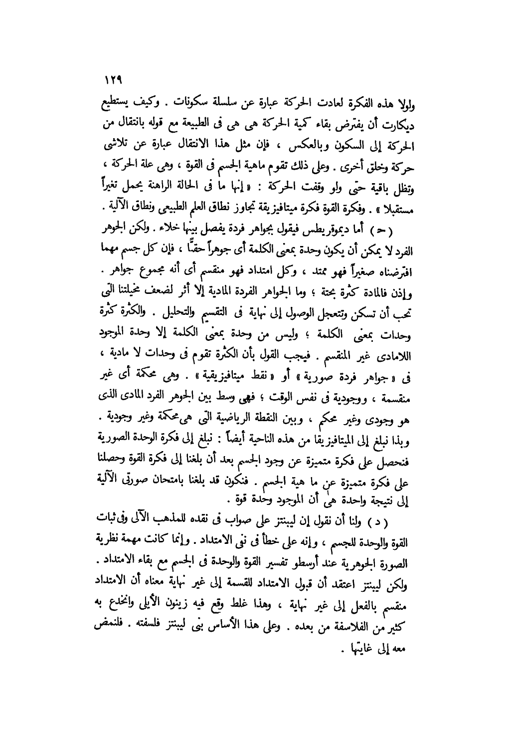 د- ولنا أن نقول: إن ليبنتز على صواب في نقده للمذهب الآلي وفي ثبات القوة والوحدة للجسم، وإنه على خطأ في نفي الامتداد. وإنما كانت مهمة نظرية الصورة الجوهرية عند أرسطو تفسير القوة والوحدة في الجسم مع بقاء الامتداد. ولكن ليبنتز اعتقد أن قبول الامتداد للقسمة إلى غير نهاية معناه أن الامتداد منقسم بالفعل إلى غير نهاية, وهذا غلط وقع فيه زينون الأيلي وانخدع به كثير من الفلاسفة من بعده. وعلى هذا الأساس بنى ليبنتز فلسفته, فلنمض معه إلى غايتها.