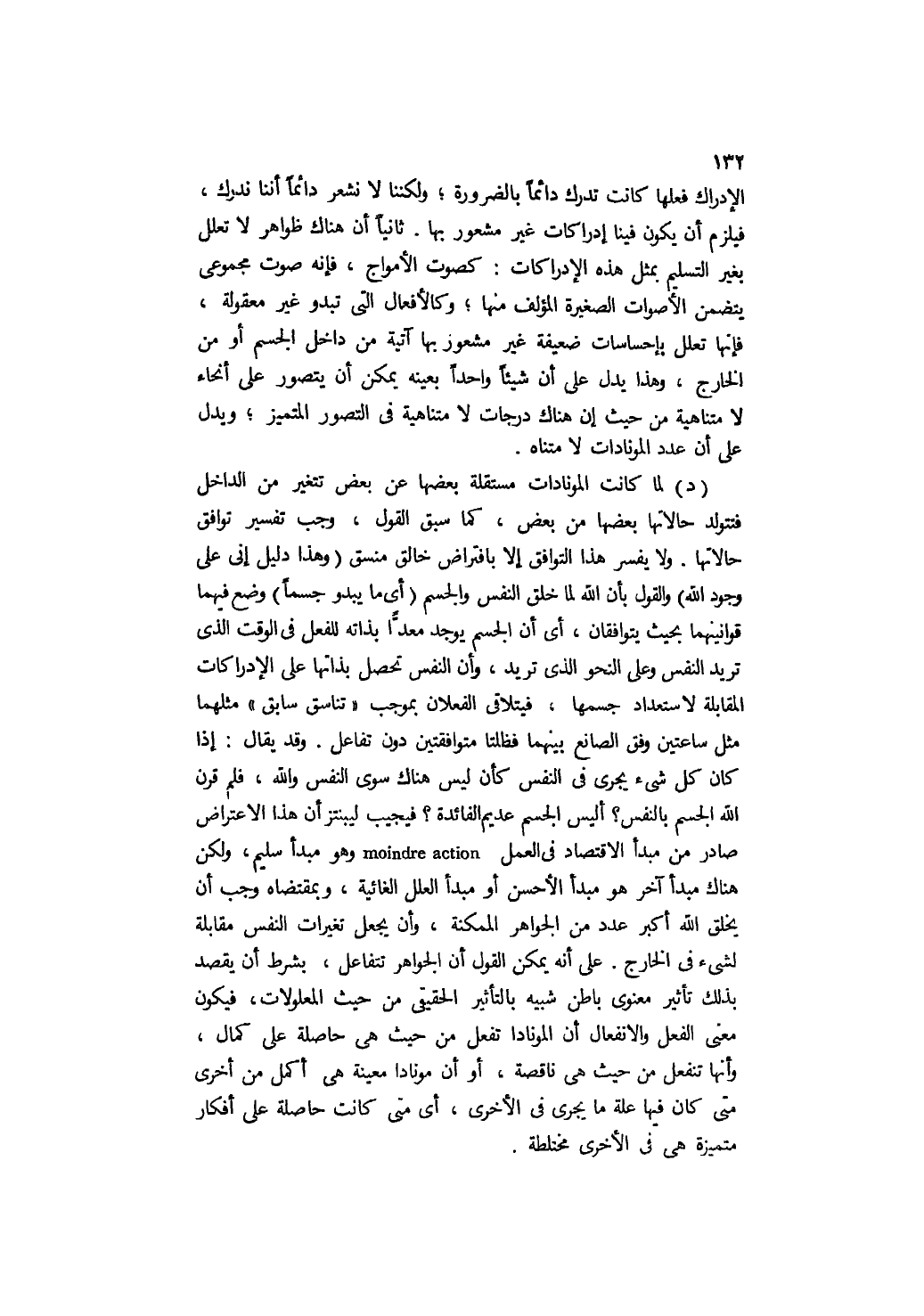 د- لما كانت المونادات مستقلة بعضها عن بعض تتغير من الداخل فتتولد حالاتها بعضها من بعض, كما سبق القول, وجب تفسير توافق حالاتها. ولا يفسر هذا التوافق إلا بافتراض خالق منسق "وهذا دليل إني على وجود الله" والقول بأن الله لما خلق النفس والجسم "أي: ما يبدو جسمًا" وضع فيهما قوانينهما بحيث يتوافقان، أي: إن الجسم يوجد معدا بذاته للفعل في الوقت الذي تريد النفس وعلى النحو الذي تريد، وإن النفس تحصل بذاتها على الإدراكات المقابلة لاستعداد جسمها، فيتلاقى الفعلان بموجب "تناسق سابق" مثلهما مثل ساعتين وفق الصانع بينهما فظلتا متوافقتين دون تفاعل. وقد يقال: إذا كان كل شيء يجري في النفس كأن ليس هناك سوى النفس والله، فلم قرن الله الجسم بالنفس؟ أليس الجسم عديم الفائدة؟ فيجيب ليبنتز أن هذا الاعترض صادر من مبدأ الاقتصاد في العمل moindre action وهو مبدأ سليم، ولكن هناك مبدأ آخر هو مبدأ الأحسن أو مبدأ العلل الغائية، وبمقتضاه وجب أن يخلق الله أكبر عدد من الجواهر الممكنة، وأن يجعل تغيرات النفس مقابلة لشيء في الخارج, على أنه يمكن القول: إن الجواهر تتفاعل، بشرط أن يُقصَد بذلك تأثير معنوي باطن شبيه بالتأثير الحقيقي من حيث المعلولات، فيكون معنى الفعل والانفعال أن المونادا تفعل من حيث هي حاصلة على كمال، وأنها تنفعل من حيث هي ناقصة، أو أن مونادا معينة هي أكمل من أخرى متى كان فيها علة ما يجري في الأخرى، أي: متى كانت حاصلة على أفكار متميزة هي في الأخرى مختلطة.