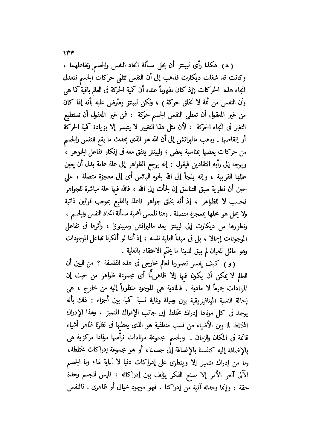 هـ- هكذا رأى ليبنتز أن يحل مسألة اتحاد النفس والجسم وتفاعلهما، وكانت قد شغلت ديكارت فذهب إلى أن النفس تتلقى حركات الجسم فتعدل اتجاه هذه الحركات "إذ كان مفهومًا عنده أن كمية الحركة في العالم باقية كما هي, وأن النفس من ثمة لا تخلق حركة"؛ ولكن ليبنتز يعترض عليه بأنه إذا كان من غير المعقول أن تعطي النفس الجسم حركة، فمن غير المعقول أن تستطيع التغير في اتجاه الحركة؛ لأن مثل هذا التغيير لا يتيسر إلا بزيادة كمية الحركة أو إنقاصها. وذهب مالبرانش إلى أن الله هو الذي يحدث ما يقع للنفس والجسم من حركات بعضها بمناسبة بعض، وليبنتز يتفق معه في إنكار تفاعل الجواهر، ويوجه إلى رأيه انتقادين فيقول: إنه يرجع الظواهر إلى علة عامة بدل أن يعين عللها القريبة، وإنه يلجأ إلى الله لجوء اليائس أي: إلى معجزة متصلة، على حين أن نظرية سبق التناسق إن لجأت إلى الله، فالله فيها علة مباشرة للجواهر فحسب لا للظواهر، إذ إنه يخلق جواهر فاعلة بالطبع بموجب قوانين ذاتية, ولا يحل هو محلها بمعجزة متصلة. وهنا نلمس أهمية مسألة اتحاد النفس والجسم، وتطورها من ديكارت إلى ليبنتز بعد مالبرانش وسبينوزا، وأثرها في تفاعل الموجودات إجمالًا، بل في مبدأ العلية نفسه، إذ إننا لو أنكرنا تفاعل الموجودات وهو ماثل للعيان لم يبق لدينا ما يختم الاعتقاد بالعلية.