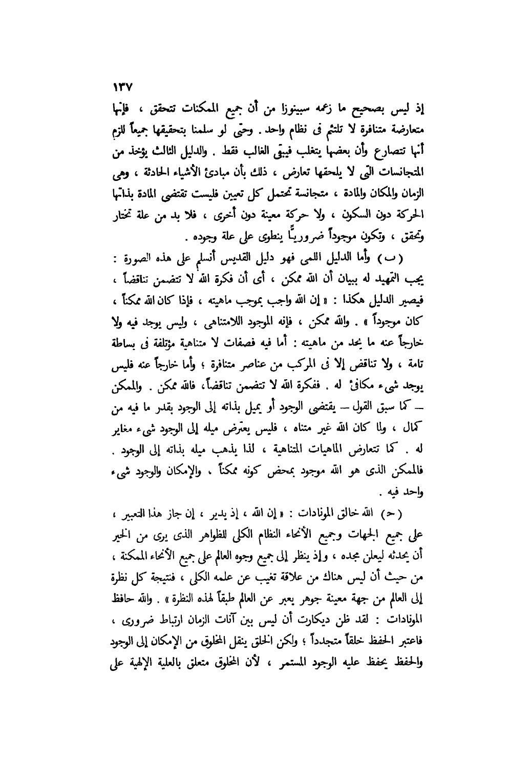 إذ ليس بصحيح ما زعمه سبينوزا من أن جميع الممكنات تتحقق، فإنها متعارضة متنافرة لا تلتئم في نظام واحد. وحتى لو سلمنا بتحقيقها جميعًا للزم أنها تتصارع, وأن بعضها يتغلب فيبقى الغالب فقط. والدليل الثالث يؤخذ من المتجانسات التي لا يلحقها تعارض؛ ذلك بأن مبادئ الأشياء الحادثة، وهي الزمان والمكان والمادة، متجانسة تحتمل كل تعيين فليست تقتضي المادة بذاتها الحركة دون السكون، ولا حركة معينة دون أخرى، فلا بد من علة تختار وتحقق وتكون موجودًا ضروريًّا ينطوي على علة وجوده.