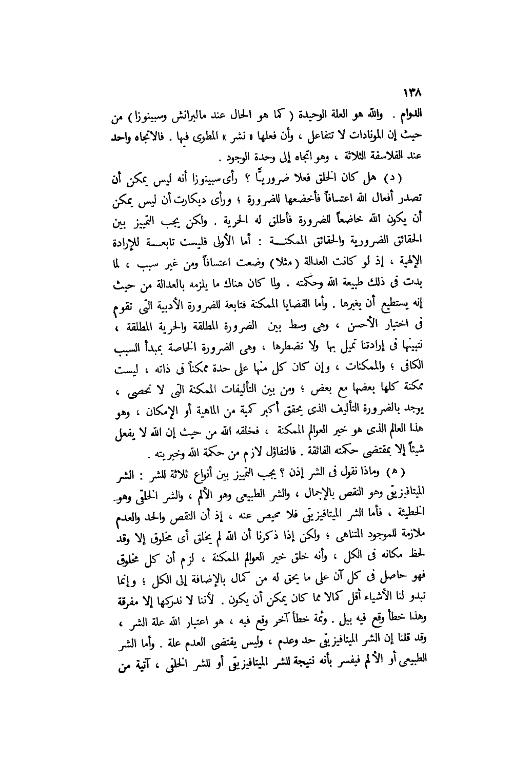 هـ- وماذا نقول في الشر إذن؟ يجب التمييز بين أنواع ثلاثة للشر: الشر الميتافيزيقي وهو النقص بالإجمال، والشر الطبيعي وهو الألم، والشر الخلقي وهو الخطيئة، فأما الشر الميتافيزيقي فلا محيص عنه، إذ إن النقص والحد والعدم ملازمة للموجود المتناهي، ولكن إذا ذكرنا أن الله لم يخلق أي مخلوق إلا وقد لحظ مكانه في الكل، وأنه خلق خير العوالم الممكنة، لزم أن كل مخلوق فهو حاصل في كل آن على ما يحق له من كمال بالإضافة إلى الكل؛ وإنما تبدو لنا الأشياء أقل كمالا مما كان يمكن أن يكون؛ لأننا لا ندركها إلا مفرقة وهذا خطأ وقع فيه بيل. وثمة خطأ آخر وقع فيه، هو اعتبار الله علة الشر، وقد قلنا: إن الشر الميتافيزيقي حد وعدم، وليس يقتضي العدم علة. وأما الشر الطبيعي أو الألم فيفسر بأنه نتيجة للشر الميتافيزيقي أو للشر الخلقي، آتية من