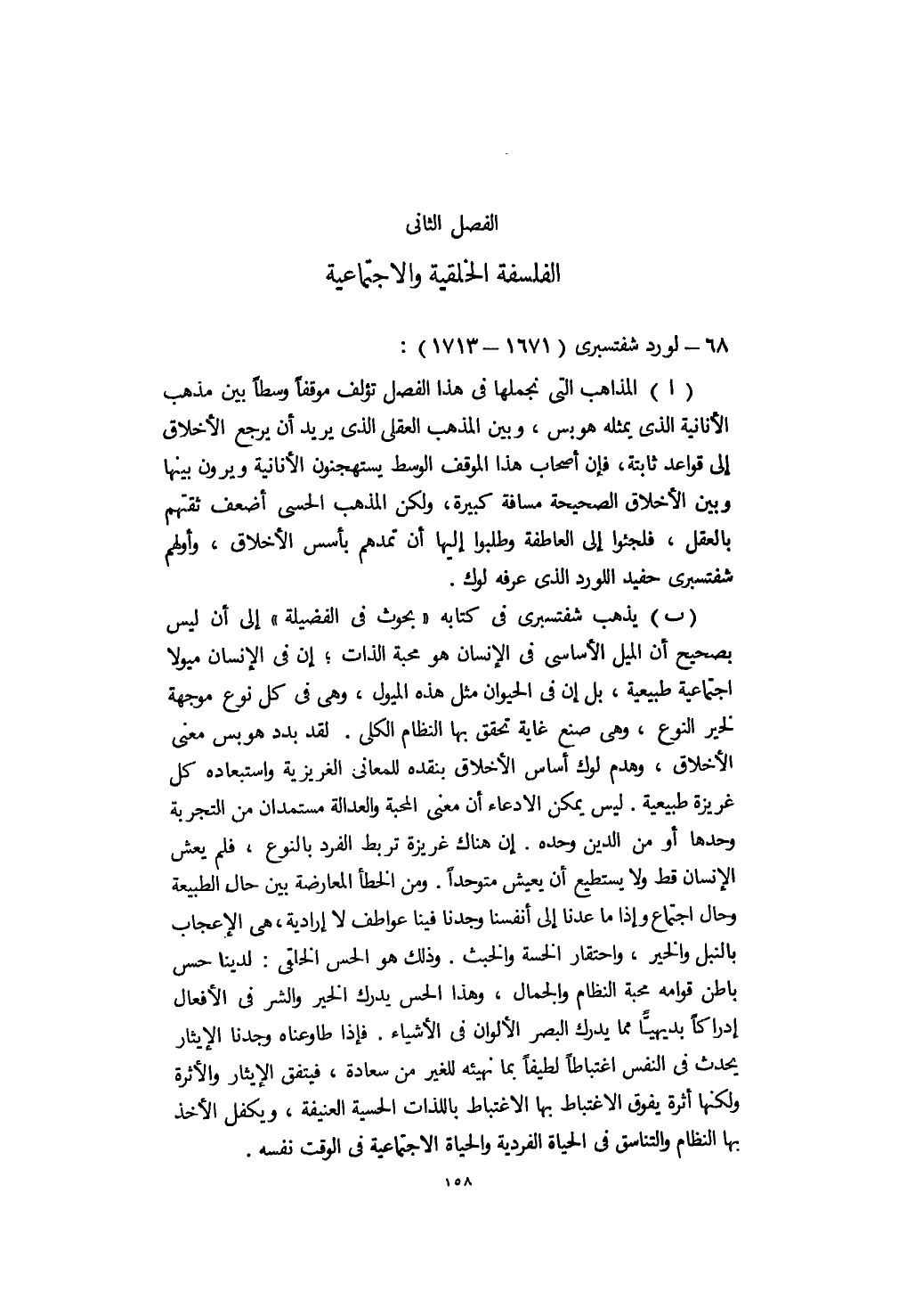أ- المذاهب التي نجملها في هذا الفصل تؤلف موقفًا وسطًا بين مذهب الأنانية الذي يمثله هوبس، وبين المذهب العقلي الذي يريد أن يرجع الأخلاق إلى قواعد ثابتة، فإن أصحاب هذا الموقف الوسط يستهجنون الأنانية ويرون بينها وبين الأخلاق الصحيحة مسافة كبيرة، ولكن المذهب الحسي أضعف ثقتهم بالعقل، فلجئوا إلى العاطفة وطلبوا إليها أن تمدهم بأسس الأخلاق، وأولهم شفتسبري حفيد اللورد الذي عرفه لوك.