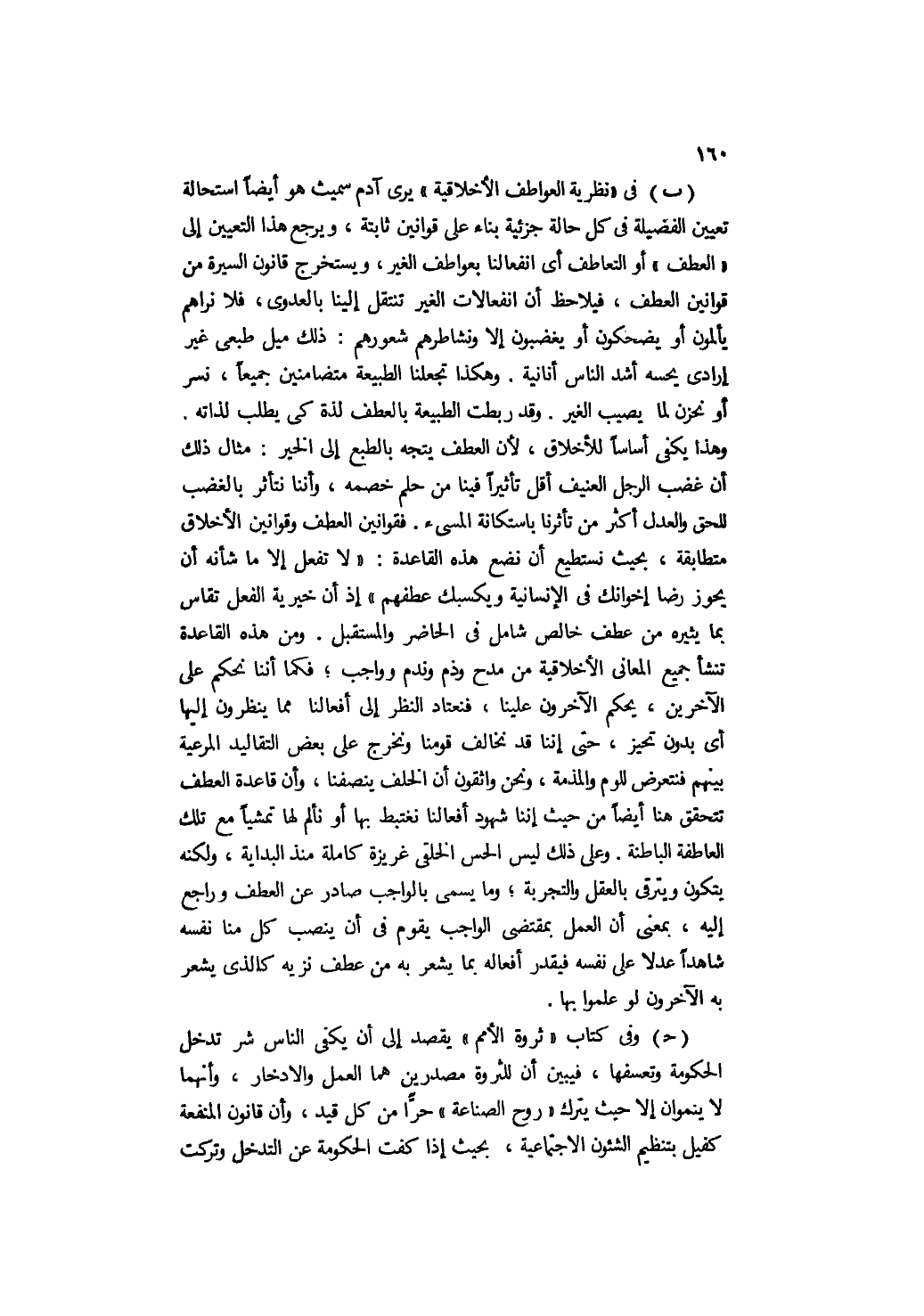ج- وفي كتاب "ثروة الأمم" يقصد إلى أن يكفى الناس شر تدخل الحكومة وتعسفها، فيبين أن للثروة مصدرين هما العمل والادخار، وأنهما لا ينموان إلا حيث يترك "روح الصناعة" حرا من كل قيد، وأن قانون المنفعة كفيل بتنظيم الشئون الاجتماعية، بحيث إذا كفت الحكومة عن التدخل وتركت