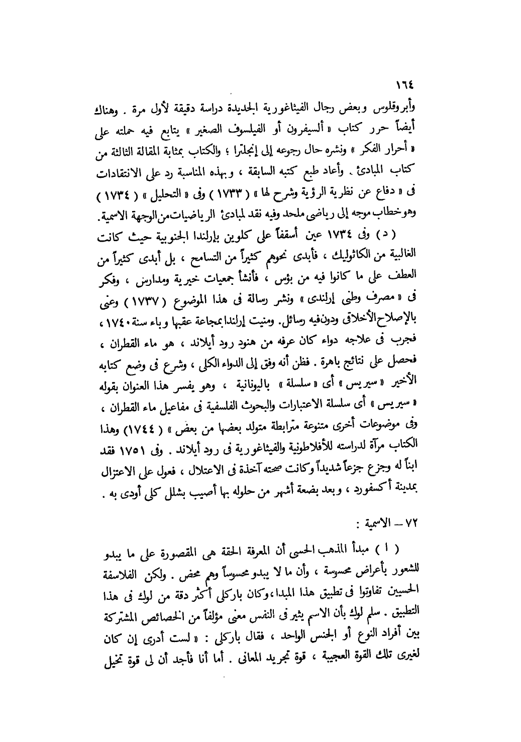 وأبروقلوس وبعض رجال الفيثاغورية الجديدة دراسة دقيقة لأول مرة. وهناك أيضًا حرر كتاب "السيفرون أو الفيلسوف الصغير" يتابع فيه حملته على "أحرار الفكر" ونشره حال رجوعه إلى إنجلترا؛ والكتاب بمثابة المقالة الثالثة من كتاب المبادئ. وأعاد طبع كتبه السابقة، وبهذه المناسبة رد على الانتقادات في "دفاع عن نظرية الرؤية وشرح لها" " 1733 " وفي "التحليل" " 1734 " وهو خطاب موجه إلى رياضي ملحد, وفيه نقد لمبادئ الرياضيات من الوجهة الاسمية.
