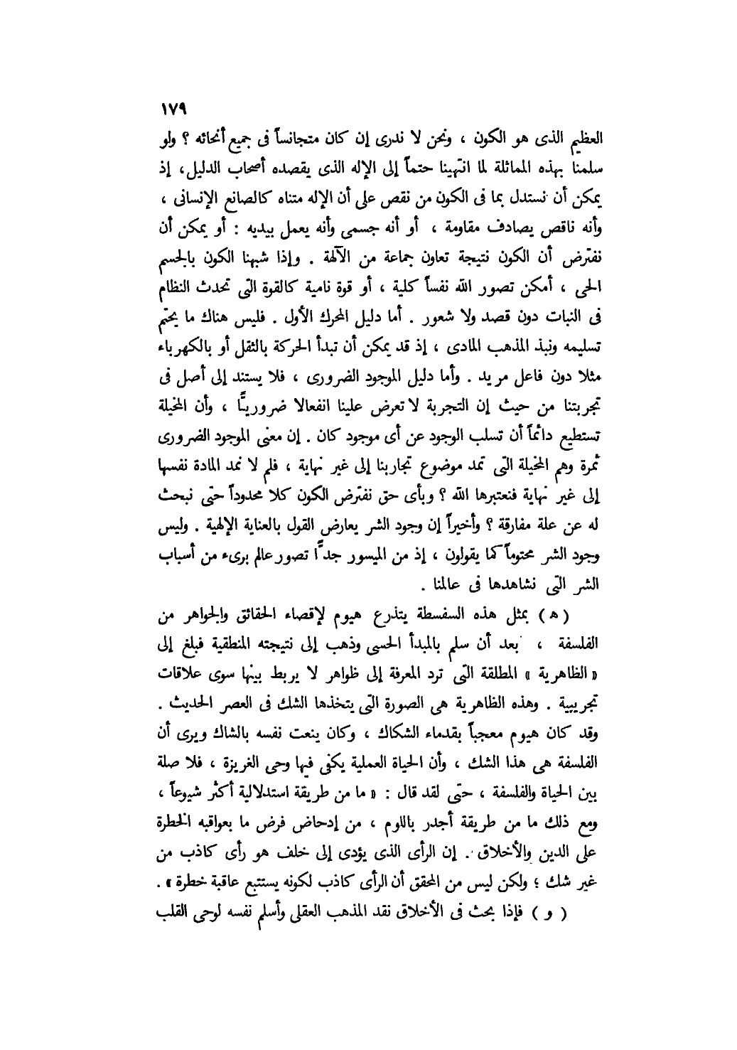 العظيم الذي هو الكون، ونحن لا ندري إن كان متجانسًا في جميع أنحائه؟ ولو سلمنا بهذه المماثلة لما انتهينا حتمًا إلى الإله الذي يقصده أصحاب الدليل، إذ يمكن أن نستدل بما في الكون من نقص على أن الإله متناهٍ كالصانع الإنساني، وأنه ناقص يصادف مقاومة، أو أنه جسمي وأنه يعمل بيديه, أو يمكن أن نفترض أن الكون نتيجة تعاون جماعة من الآلهة. وإذا شبهنا الكون بالجسم الحي، أمكن تصور الله نفسًا كلية، أو قوة نامية كالقوة التي تحدث النظام في النبات دون قصد ولا شعور. أما دليل المحرك الأول, فليس هناك ما يحتم تسليمه ونبذ المذهب المادي، إذ قد يمكن أن تبدأ الحركة بالثقل أو بالكهرباء مثلا دون فاعل مريد. وأما دليل الموجود الضروري، فلا يستند إلى أصل في تجربتنا من حيث إن التجربة لا تعرض علينا انفعالًا ضروريًّا، وإن المخيلة تستطيع دائما أن تسلب الوجود عن أي موجود كان. إن معنى الموجود الضروري ثمرة وهم المخيلة التي تمد موضوع تجاربنا إلى غير نهاية، فلم لا نمد المادة نفسها إلى غير نهاية فنعتبرها الله؟ وبأي حق نفترض الكون كلا محدودا حتى نبحث له عن علة مفارقة؟ وأخيرًا, إن وجود الشر يعارض القول بعناية الإلهية, وليس وجود الشر محتومًا كما يقولون؛ إذ من الميسور جدا تصور عالم بريء من أسباب الشر التي نشاهدها في عالمنا.