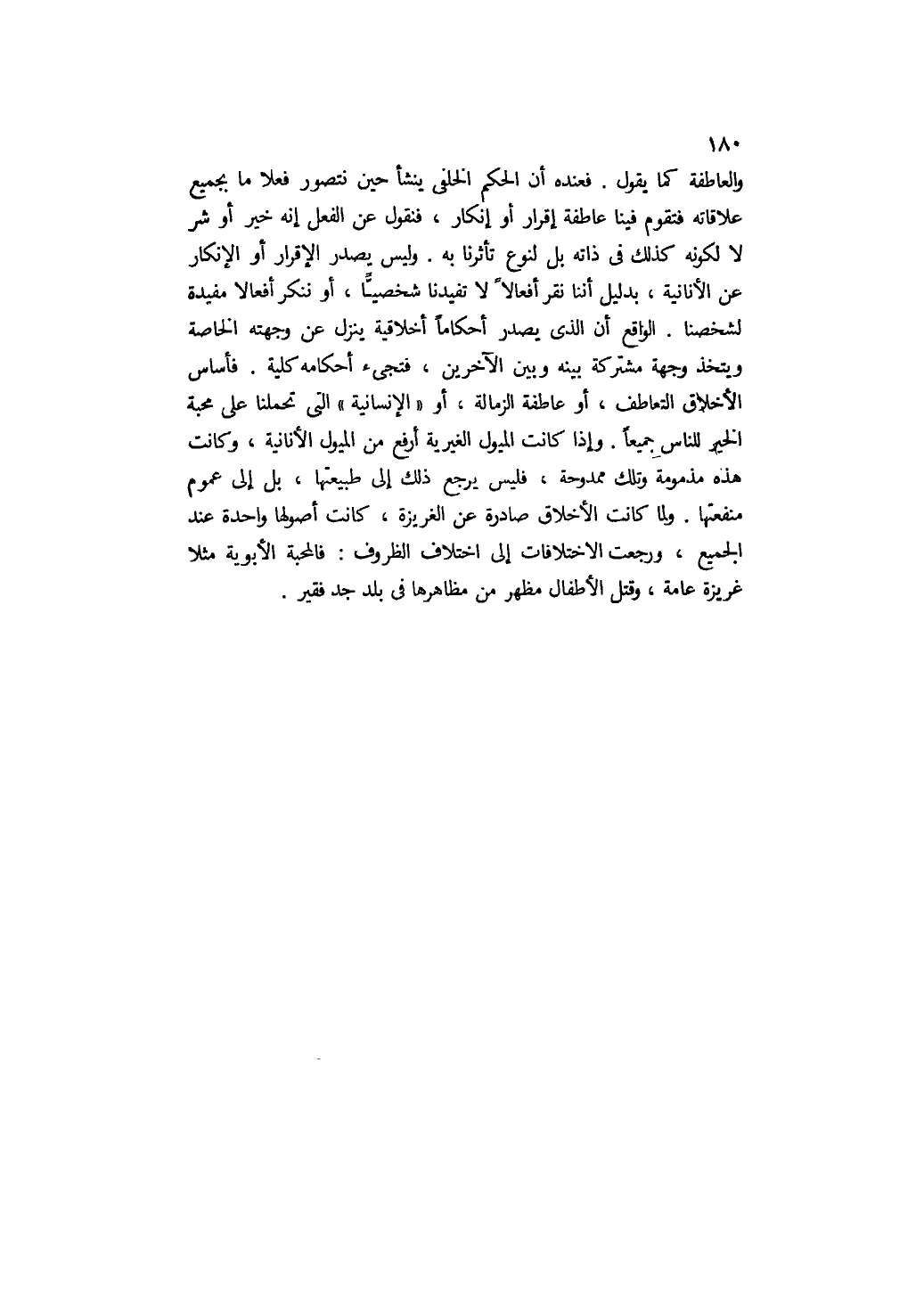 والعاطفة كما يقول. فعنده أن الحكم الخلقي ينشأ حين نتصور فعلًا ما بجميع علاقاته, فتقوم فينا عاطفة إقرار أو إنكار. فنقول عن الفعل: إنه خير أو شر لا لكونه كذلك في ذاته بل لنوع تأثرنا به. وليس يصدر الإقرار أو الإنكار عن الأنانية، بدليل أننا نقر أفعالًا لا تفيدنا شخصيا، أو ننكر أفعالا مفيدة لشخصنا. الواقع أن الذي يصدر أحكامًا أخلاقية ينزل عن وجهته الخاصة ويتخذ وجهة مشتركة بينه وبين الآخرين، فتجيء أحكامه كلية. فأساس الأخلاق التعاطف، أو عاطفة الزمالة، أو "الإنسانية" التي تحملنا على محبة الخير للناس جميعًا. وإذا كانت الميول الغيرية أرفع من الميول الأنانية، وكانت هذه مذمومة وتلك ممدوحة، فليس يرجع ذلك إلى طبيعتها، بل إلى عموم منفعتها. ولما كانت الأخلاق صادرة عن الغريزة، كانت أصولها واحدة عند الجميع، ورجعت الاختلافات إلى اختلاف الظروف. فالمحبة الأبوية مثلًا غريزة عامة، وقتل الأطفال مظهر من مظاهرها في بلد جد فقير.