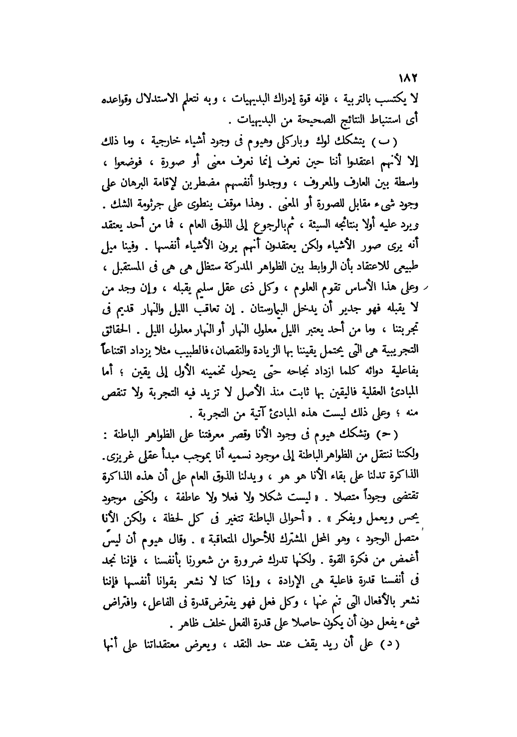 ب- يتشكك لوك وباركلي وهيوم في وجود أشياء خارجية، وما ذلك إلا لأنهم اعتقدوا أننا حين نعرف إنما نعرف معنى أو صورة، فوضعوا واسطة بين العارف والمعروف، ووجدوا أنفسهم مضطرين لإقامة البرهان على وجود شيء مقابل للصورة أو المعنى, وهذا موقف ينطوي على جرثومة الشك. ويرد عليه أولا بنتائجه السيئة، ثم بالرجوع إلى الذوق العام، فما من أحد يعتقد أنه يرى صور الأشياء ولكن يعتقدون أنهم يرون الأشياء أنفسها. وفينا ميل طبيعي للاعتقاد بأن الروابط بين الظواهر المدركة ستظل هي هي في المستقبل، وعلى هذا الأساس تقوم العلوم، وكل ذي عقل سليم يقبله، وإن وجد من لا يقبله فهو جدير أن يدخل البيمارستان. إن تعاقب الليل والنهار قديم في تجربتنا, وما من أحد يعتبر الليل معلول النهار أو النهار معلول الليل. الحقائق التجريبية هي التي يحتمل يقيننا بها الزيادة والنقصان، فالطبيب مثلًا يزداد اقتناعًا بفاعلية دوائه كلما ازداد نجاحه حتى يتحول تخمينه الأول إلى يقين؛ أما المبادئ العقلية فاليقين بها ثابت منذ الأصل لا تزيد فيه التجربة ولا تنقص منه؛ وعلى ذلك ليست هذه المبادئ آتية من التجربة.