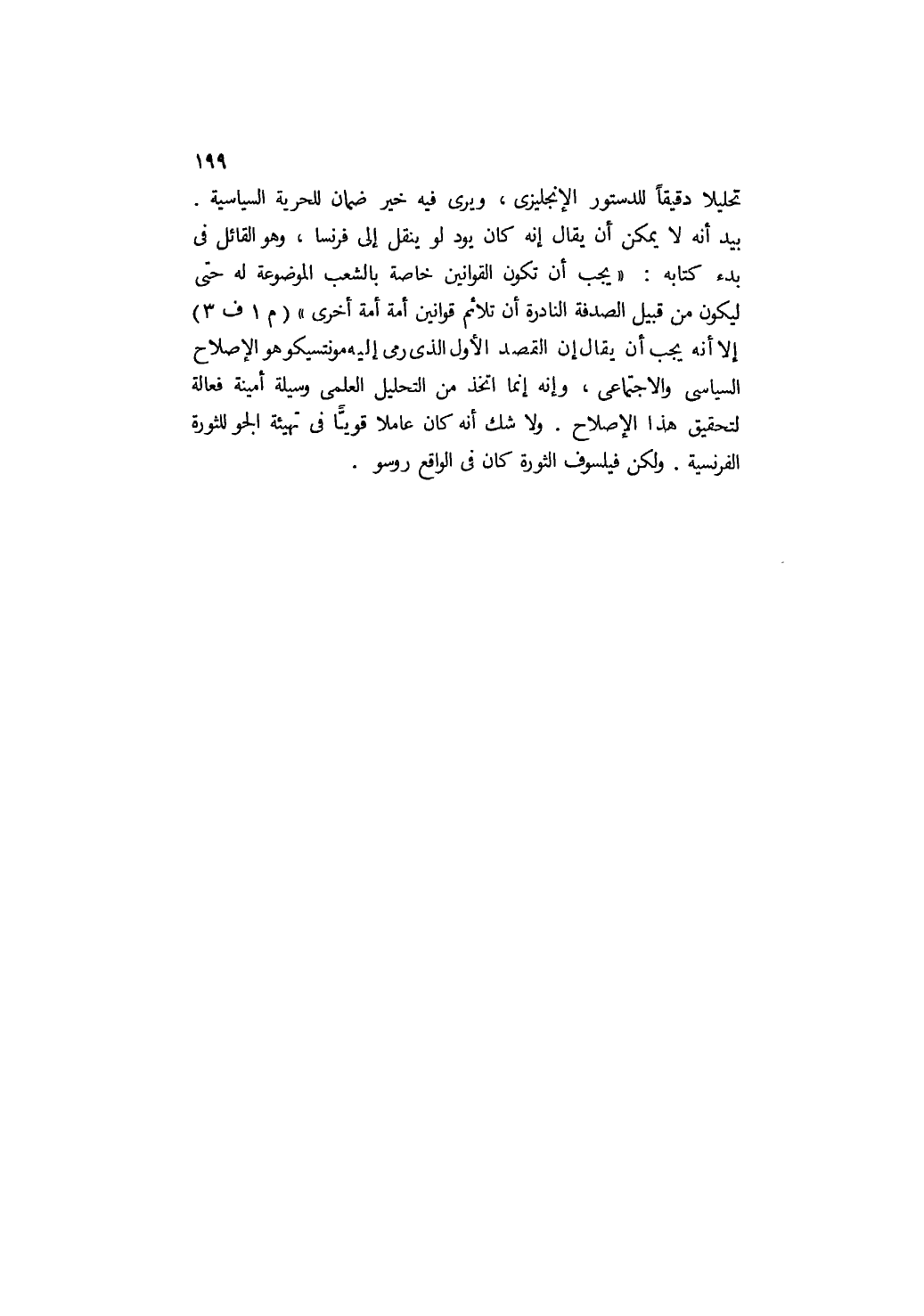 تحليلًا دقيقًا للدستور الإنجليزي، ويرى فيه خير ضمان للحرية السياسية. بيد أنه لا يمكن أن يقال: إنه كان يود لو ينقل إلى فرنسا، وهو القائل في بدء كتابه: "يجب أن تكون القوانين خاصة بالشعب الموضوعة له حتى ليكون من قبيل الصدفة النادرة أن تلائم قوانين أمة, أمة أخرى" "م 1 ف 3 " إلا أنه يجب أن يقال: إن القصد الأول الذي رمى إليه مونتسكيو هو الإصلاح السياسي والاجتماعي، وإنه إنما اتخذ من التحليل العلمي وسيلة أمينة فعالة لتحقيق هذا الإصلاح. ولا شك أنه كان عاملًا قويًّا في تهيئة الجو للثورة الفرنسية, ولكن فيلسوف الثورة كان في الواقع روسو.