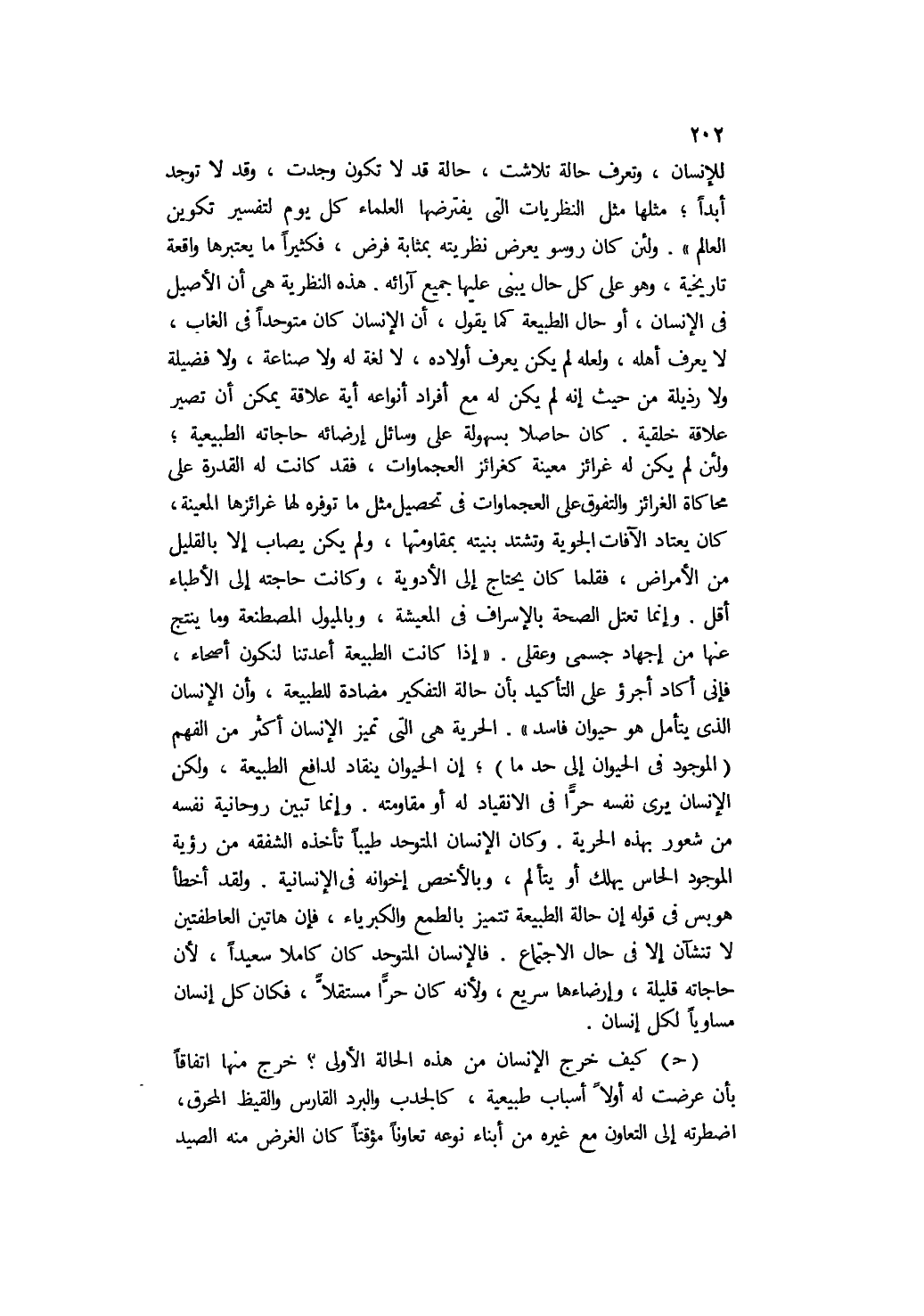 للإنسان، وتعرف حالة تلاشت، حالة قد لا تكون وجدت، وقد لا توجد أبدًا، مثلها مثل النظريات التي يفترضها العلماء كل يوم لتفسير تكوين العالم". ولئن كان روسو يعرض نظريته بمثابة فرض، فكثيرًا ما يعتبرها واقعة تاريخية، وهو على كل حال يبني عليها جميع آرائه. هذه النظرية هي أن الأصيل في الإنسان، أو حال الطبيعة كما يقول، أن الإنسان كان متوحدًا في الغاب, لا يعرف أهله، ولعله لم يكن يعرف أولاده، لا لغة له ولا صناعة، ولا فضيلة ولا رذيلة من حيث إنه لم يكن له مع أفراد أنواعه أية علاقة يمكن أن تصير علاقة خلقية. كان حاصلا بسهولة على وسائل إرضائه حاجاته الطبيعية؛ ولئن لم يكن له غرائز معينة كغرائز العجماوات، فقد كانت له القدرة على محاكاة الغرائز والتفوق على العجماوات في تحصيل مثل ما توفره لها غرائزها المعينة، كان يعتاد الآفات الجوية وتشتد بنيته بمقاومتها، ولم يكن يصاب إلا بالقليل من الأمراض، فقلما كان يحتاج إلى الأدوية، وكانت حاجته إلى الأطباء أقل. وإنما تعتل الصحة بالإسراف في المعيشة، وبالميول المصطنعة وما ينتج عنها من إجهاد جسمي وعقلي. "إذا كانت الطبيعة أعدتنا لنكون أصحاء، فإني أكاد أجرؤ على التاكيد بأن حالة التفكير مضادة للطبيعة، وأن الإنسان الذي يتأمل هو حيوان فاسد". الحرية هي التي تميز الإنسان أكثر من الفهم "الموجود في الحيوان إلى حد ما". إن الحيوان ينقاد لدافع الطبيعة، ولكن الإنسان يرى نفسه حرًّا في الانقياد له أو مقاومته. وإنما تبين روحانية نفسه من شعور بهذه الحرية. وكان الإنسان المتوحد طيبًا تأخذه الشفقه من رؤية الموجود الحاس يهلك أو يتألم، وبالأخص إخوانه في الإنسانية. ولقد أخطأ هوبس في قوله: إن حالة الطبيعة تتميز بالطمع والكبرياء، فإن هاتين العاطفتين لا تنشآن إلا في حال الاجتماع. فالإنسان المتوحد كان كاملًا سعيدًا؛ لأن حاجاته قليلة، وإرضاءها سريع, ولأنه كان حرا مستقلا، فكان كل إنسان مساويًا لكل إنسان.