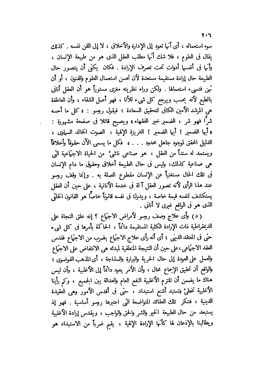 د- وأي علاج وصف روسو لأمراض الاجتماع؟ إنه علق النجاة على الديمقراطية ذات الإرادة الكلية المستقيمة دائمًا، الحاكمة بأمرها في كل شيء حتى في المعتقد الديني؛ أي: إنه رأى علاج الاجتماع بضرب من الاجتماع فقدس العقد الاجتماعي، على حين أن النتيجة المنطقية لمبدئه هي الانتفاض على الاجتماع والعمل على العودة إلى حال الحرية والبرارة والسذاجة، أي: المذهب الفوضوي؛ والواقع أن تحقيق الإجماع محال، وأن الأمر يعود دائما إلى الأغلبية، وأن ليس هناك ما يضمن أن تلتزم الأغلبية النفع العام والعدالة بين الجميع، وكم رأينا الأغلبية تخطئ وتستبد أشنع استبداد، حتى في أقدس الأمور وهي العقيدة الدينية، فتنكر تلك العقائد المتواضعة التي اعتبرها روسو أساسية. فهو إذ يستبعد من حال الطبيعة الخير والشر والحق والواجب, ويقدس إرادة الأغلبية ويطالبنا بالإذعان لها كأنها الإرادة الإلهية, يقيم ضربًا من الاستبداد هو