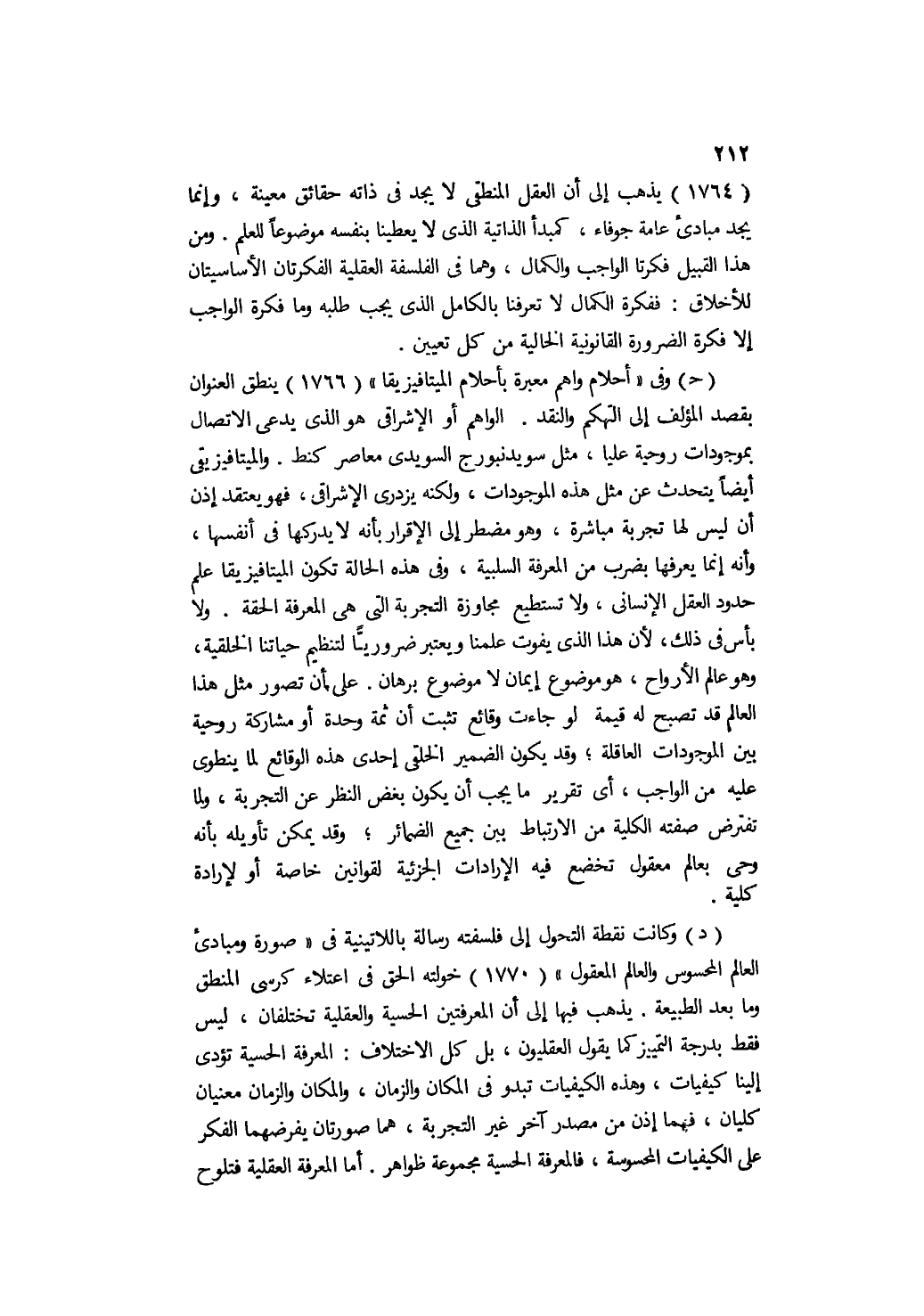 " 1764 " يذهب إلى أن العقل المنطقي لا يجد في ذاته حقائق معينة، وإنما يجد مبادئ عامة جوفاء، كمبدأ الذاتية الذي لا يعطينا بنفسه موضوعًا للعلم. ومن هذا القبيل فكرتا الواجب والكمال، وهما في الفلسفة العقلية الفكرتان الأساسيتان للأخلاق. ففكرة الكمال لا تعرفنا بالكامل الذي يجب طلبه وما فكرة الواجب إلا فكرة الضرورة القانونية الخالية من كل تعيين.