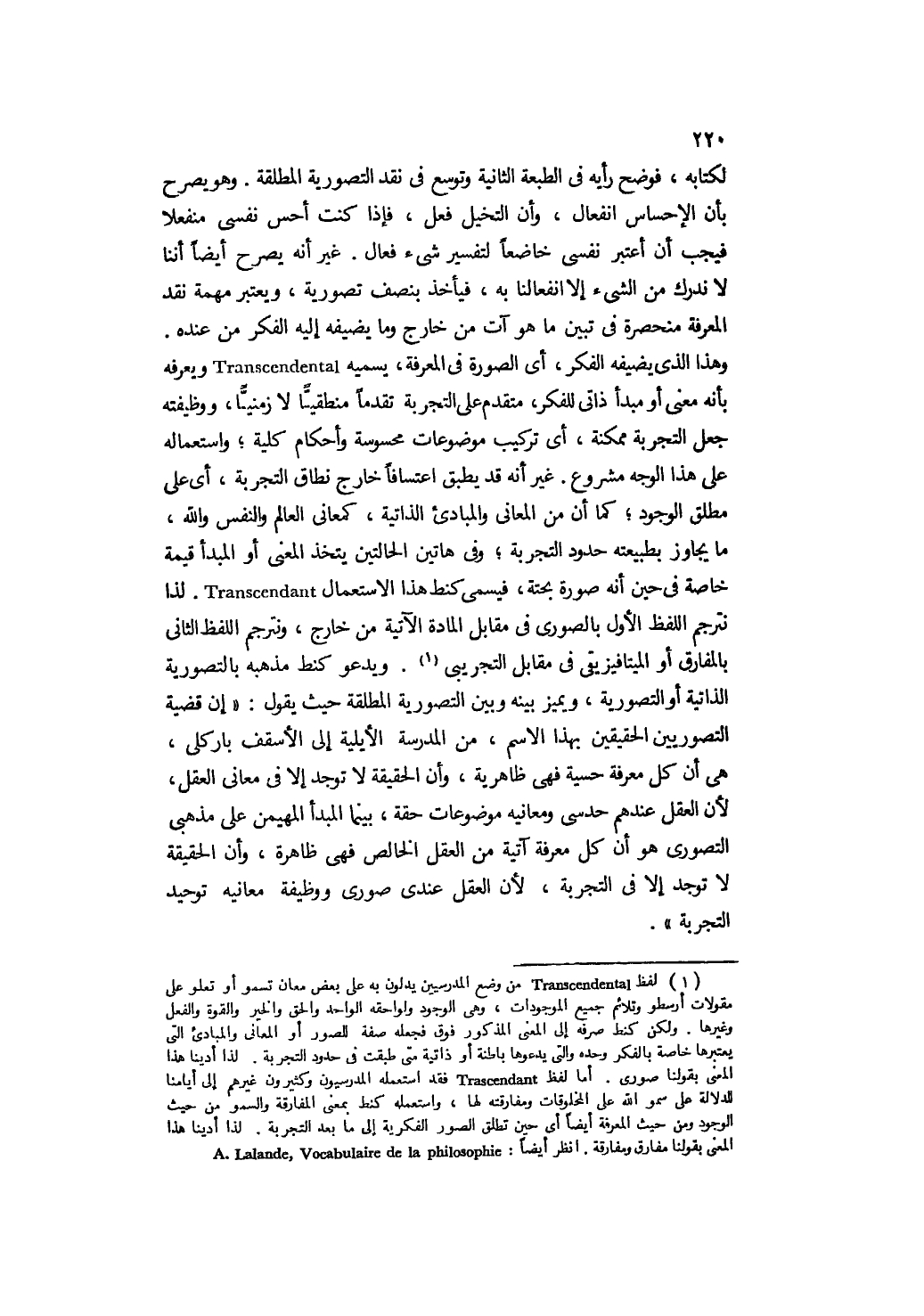 1 لفظ Transcendental من وضع المدرسيين يدلون به على بعض معانٍ تسمو أو تعلو على مقولات أرسطو وتلائم جميع الموجودات, وهي الوجود ولواحقه الواحد والحق والخير والقوة والفعل وغيرها. ولكن كنط صرفه إلى المعنى المذكور فوق, فجعله صفة للصور أو المعاني والمبادئ التي يعتبرها خاصة بالفكر وحده, والتي يدعوها باطنة أو ذاتية متى طبقت في حدود التجربة. لذا أدينا هذا المعنى بقولنا: صوري. أما لفظ Transcendant فقد استعمله المدرسيون وكثيرون غيرهم إلى أيامنا للدلالة على سمو الله على المخلوقات ومفارقته لها، واستعمله كنط بمعنى المفارقة والسمو من حيث الوجود ومن حيث المعرفة أيضا, أي: حين تطلق الصور الفكرية إلى ما بعد التجربة؛ لذا أدينا هذا المعنى بقولنا: مفارق ومفارقة. انظر أيضًا: A Lalande, Vocabulaire de la philosophie.