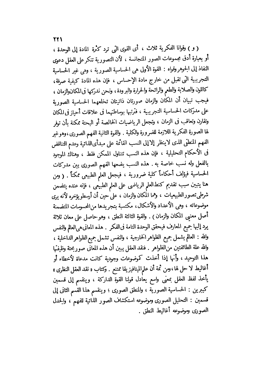 ووقوانا الفكرية ثلاث، أي: القوى التي ترد كثرة المادة إلى الوحدة، أو بعبارة أدق: مجموعات الصور المتجانسة؛ لأن التصورية تنكر على العقل دعوى النفاذ إلى الجوهر وقواه. القوة الأولى هي الحساسية الصورية، وهي غير الحساسية التجريبية التي تقبل من خارج مادة الإحساس، فإن هذه المادة كيفية صرفة، كاللون والصلابة والطعم والرائحة والحرارة والبرودة، ونحن ندركها في المكان والزمان، فيجب تبيان أن المكان والزمان صورتان ذاتيتان تخلعهما الحساسية الصورية على مدركات الحساسية التجريبية، فترتبها بوساطتهما في علاقات أحياز في المكان وتقارن وتعاقب في الزمان، وتجعل الرياضيات الخالصة أو البحتة ممكنة بأن توفر لها الصورة الفكرية اللازمة للضرورة والكلية. والقوة الثانية الفهم الصوري، وهو غير الفهم المنطقي الذي لا ينظر إلا إلى النسب القائمة على مبدأي الذاتية وعدم التناقض في الأحكام التحليلية، فإن هذه النسب تتناول الممكن فقط، وهناك الموجود بالفعل وله نسب خاصة به. هذه النسب يضعها الفهم الصوري بين مدركات الحساسية فيؤلف أحكامًا كلية ضرورية, فيجعل العلم الطبيعي ممكنًا. "ومن هنا يتبين سبب تقديم كنط العلم الرياضي على العلم الطبيعي، فإنه عنده يتضمن شرطي تصور الطبيعيات، وهما المكان والزمان، على حين أن أرسطو يؤخره لأنه يرى موضوعاته، وهي الأعداد والأشكال، مكتسبة بتجريدها من المحسوسات المتضمنة أصل معنيي المكان والزمان". والقوة الثالثة النطق، وهو حاصل على معانٍ ثلاثة يرد إليها جميع المعارف فيحقق الوحدة التامة في الفكر. هذه المعاني هي العالم ولنفس والله. العالم يشمل جميع الظواهر الخارجية، والنفس تشمل جميع الظواهر الداخلية، والله علة الطائفتين من الظواهر. فنقد العقل يبين أن هذه المعاني صور بحتة وظيفتها هذا التوحيد، وأنها إذا أخذت كموضوعات وجودية كانت مدعاة لأخطاء أو أغاليط لا حل لها، ومن ثمة فإن علم الميتافيزيقا ممتنع. وكتاب "نقد العقل النظري" يأخذ لفظ العقل بمعنى واسع يعادل قولنا: القوة الداركة. وينقسم إلى قسمين كبيرين: الحساسية الصورية، والمنطق الصوري، وينقسم هذا القسم الثاني إلى قسمين: التحليل الصوري وموضوعه استكشاف الصور الذاتية للفهم، والجدل الصوري وموضوعه أغاليط النطق.