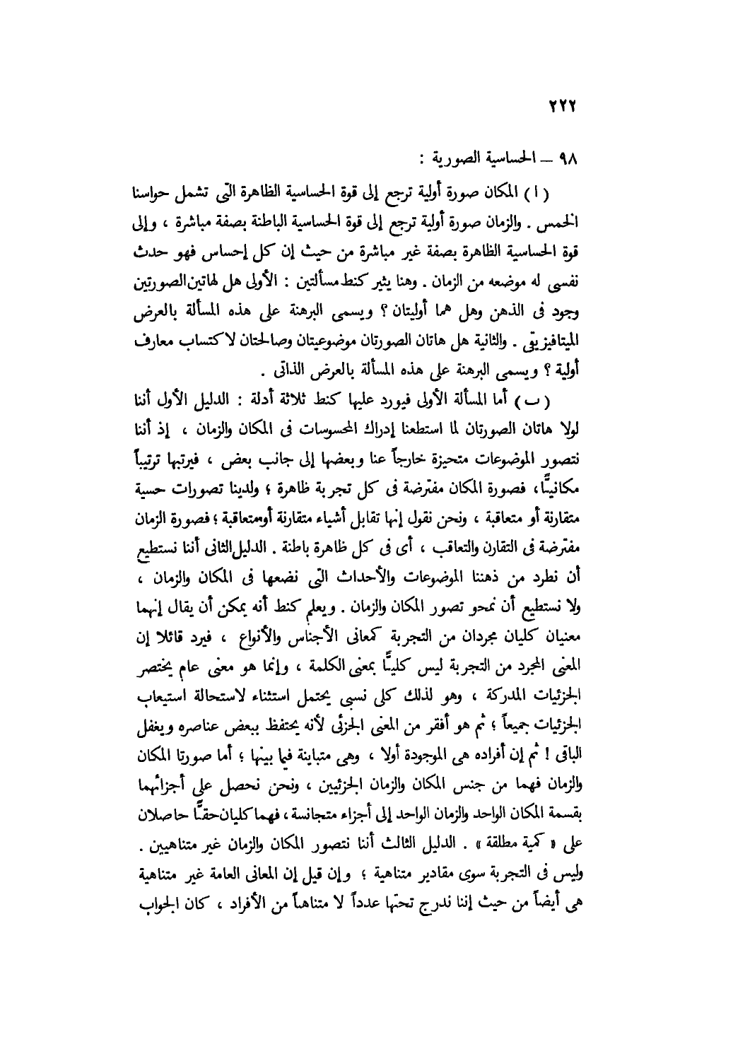 ب- أما المسألة الأولى فيورد عليها كنط ثلاثة أدلة: الدليل الأول أننا لولا هاتان الصورتان لما استطعنا إدراك المحسوسات في المكان والزمان، إذ إننا نتصور الموضوعات متحيزة خارجًا عنا وبعضها إلى جانب بعض، فيرتبها ترتيبًا مكانيًّا، فصورة المكان مفترضة في كل تجربة ظاهرة، ولدينا تصورات حسية متقارنة أو متعاقبة، ونحن نقول: إنها تقابل أشياء متقارنة أو متعاقبة، فصورة الزمان مفترضة في التقارن والتعاقب، أي: في كل ظاهرة باطنة. الدليل الثاني أننا نستطيع أن نطرد من ذهننا الموضوعات والأحداث التي نضعها في المكان والزمان، ولا نستطيع أن نمحو تصور المكان والزمان. ويعلم كنط أنه يمكن أن يقال: إنهما معنيان كليان مجردان من التجربة كمعاني الأجناس والأنواع، فيرد قائلًا: إن المعنى المجرد من التجربة ليس كليا بمعنى الكلمة، وإنما هو معنى عام يختصر الجزئيات المدركة، وهو لذلك كلي نسبي يحتمل استثناء لاستحالة استيعاب الجزئيات جميعًا؛ ثم هو أفقر من المعنى الجزئي؛ لأنه يحتفظ ببعض عناصره ويغفل الباقي! ثم إن أفراده هي الموجودة أولًا، وهي متباينة فيما بينها؛ أما صورتا المكان والزمان فهما من جنس المكان والزمان الجزئيين، ونحن نحصل على أجزائهما بقسمة المكان الواحد والزمان الواحد إلى أجزاء متجانسة، فهما كليان حقا حاصلان على "كمية مطلقة". الدليل الثالث أننا نتصور المكان والزمان غير متناهيين. وليس في التجربة سوى مقادير متناهية؛ وإن قيل: إن المعاني العامة غير متناهية هي أيضًا من حيث إننا ندرج تحتها عددًا لامتناهيًا من الأفراد، كان الجواب