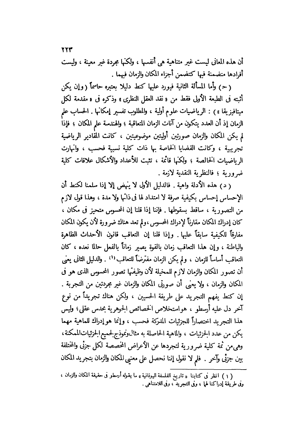 1 انظر في كتابنا "تاريخ الفلسفة اليونانية" ما يقوله أرسطو في حقيقة المكان والزمان، وفي طريقة إدراكنا لهما، وفي التجريد، وفي اللامتناهي.
