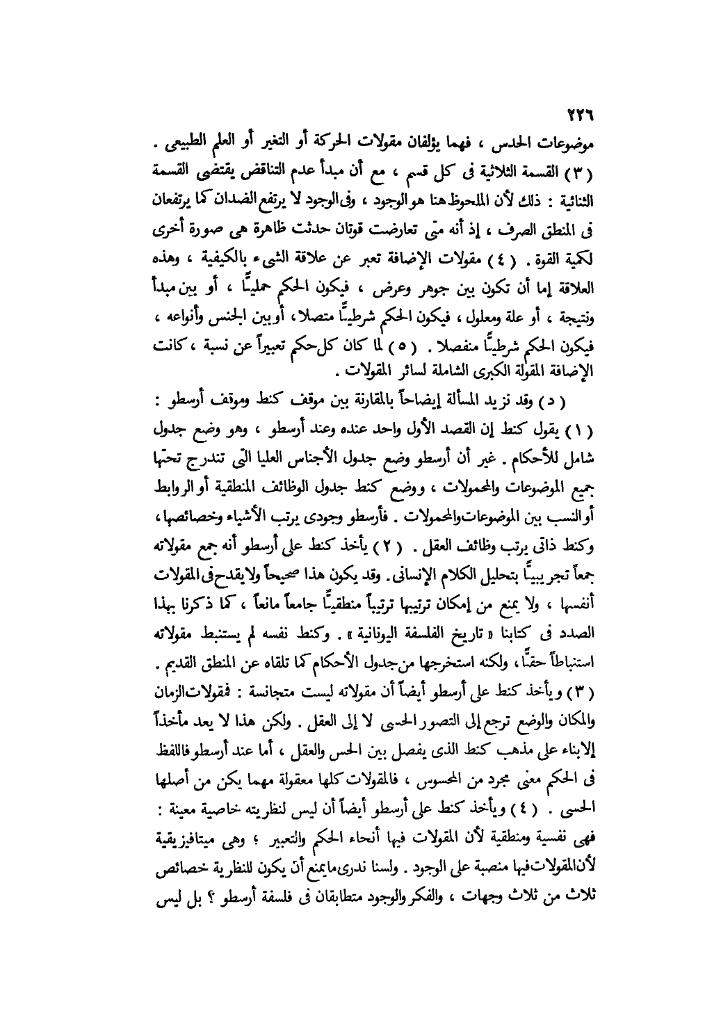 4 - ويأخذ كنط على أرسطو أيضًا أن ليس لنظريته خاصية معينة, فهي نفسية ومنطقية لأن المقولات فيها أنحاء الحكم والتعبير, وهي ميتافيزيقية لأن المقولات فيها منصبة على الوجود. ولسنا ندري ما يمنع أن يكون للنظرية خصائص ثلاث من ثلاث وجهات، والفكر والوجود متطابقان في فلسفة أرسطو؟ بل ليس