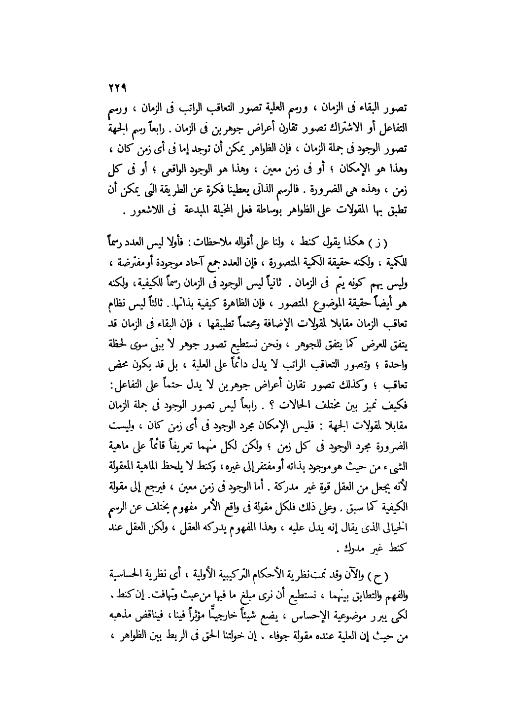 ز- هكذا يقول كنط، ولنا على أقواله ملاحظات: فأولا ليس العدد رسمًا للكمية، ولكنه حقيقة الكمية المتصورة، فإن العدد جميع آحاد موجودة أو مفترضة، وليس يهم كونه يتم في الزمان. ثانيًا ليس الوجود في الزمان رسمًا للكيفية، ولكنه هو أيضًا حقيقة الموضوع المتصور، فإن الظاهرة كيفية بذاتها. ثالثًا ليس نظام تعاقب الزمان مقابلا لمقولات الإضافة ومحتما تطبيقها، فإن البقاء في الزمان قد يتفق للعرض كما يتفق للجوهر، ونحن نستطيع تصور جوهر لا يبقى سوى لحظة واحدة؛ وتصور التعاقب الراتب لا يدل دائمًا على العلية، بل قد يكون محض تعاقب؛ وكذلك تصور تقارن أعراض جوهرين لا يدل حتمًا على التفاعل, فكيف نميز بين مختلف الحالات؟ رابعًا ليس تصور الوجود في جملة الزمان مقابلا لمقولات الجهة؛ فليس الإمكان مجرد الوجود في أي زمان كان، وليست الضرورة مجرد الوجود في كل زمن؛ ولكن لكل منهما تعريفًا قائمًا على ماهية الشيء من حيث هو موجود بذاته أو مفتقر إلى غيره، وكنط لا يلحظ الماهية المعقولة لأنه يجعل من العقل قوة غير مدركة. أما الوجود في زمن معين، فيرجع إلى مقولة الكيفية كما سبق. وعلى ذلك, فلكل مقولة في واقع الأمر مفهوم يختلف عن الرسم الخيالي الذي يقال: إنه يدل عليه، وهذا المفهوم يدركه العقل، ولكن العقل عند كنط غير مدرك.
