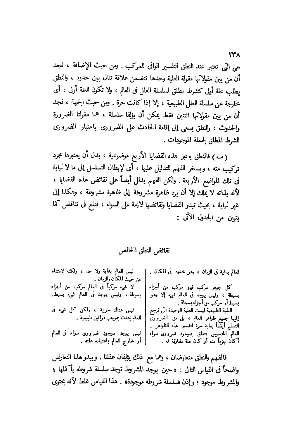 ب- فالنطق يعتبر هذه القضايا الأربع موضوعية، بدل أن يعتبرها مجرد تركيب منه، ويسخر الفهم للتدليل عليها، أي: لإبطال التسلسل إلى ما لا نهاية في تلك المواضع الأربعة. ولكن الفهم يدلل أيضًا على نقائض هذه القضايا؛ لأنه بذاته لا يملك إلا أن يرد ظاهرة مشروطة إلى ظاهرة مشروطة، وهكذا إلى غير نهاية، بحيث تبدو القضايا ونقائضها لازمة على السواء، فنقع في تناقض كما يتبين من الجدول الآتي: