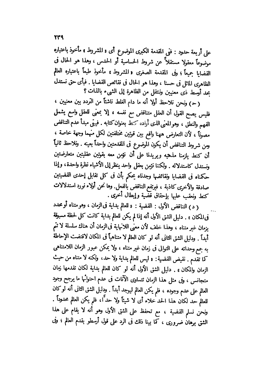 د- التناقض الأول: القضية: "للعالم بداية في الزمان، وهو متناهٍ أو محدود في المكان". دليل الشق الأول أنه إذا لم يكن للعالم بداية كانت كل لحظة مسبوقة بزمان غير متناهٍ، وهذا خلف لأن معنى اللانهاية في الزمان أن هناك سلسلة لا تتم أبدًا. ودليل الشق الثاني أنه لو كان العالم لامتناهيًا في المكان لاقتضت الإحاطة به جمع وحداته على التوالي في زمان غير متناهٍ، ولا يمكن عبور الزمان اللامتناهي كما تقدم. نقيض القضية: "ليس للعالم بداية ولا حد، ولكنه لامتناه من حيث الزمان والمكان". دليل الشق الأول أنه لو كان للعالم بداية لكان تقدمها زمان متجانس، وفي مثل هذا الزمان تتساوى الآنات في عدم احتوائها ما يرجح وجود العالم على عدم وجوده، فلم يكن العالم ليوجد أبدًا. ودليل الشق الثاني أنه لو كان للعالم حد لكان هذا الحد خلاء أي: لا شيئًا ولا حدًّا، فلم يكن العالم محدودًا. ونحن نسلم القضية، مع تحفظ على الشق الأول وهو أنه لا يقام على هذا الشق برهان ضروري، كما بينا ذلك في الرد على قول أرسطو بقدم العالم، وفي