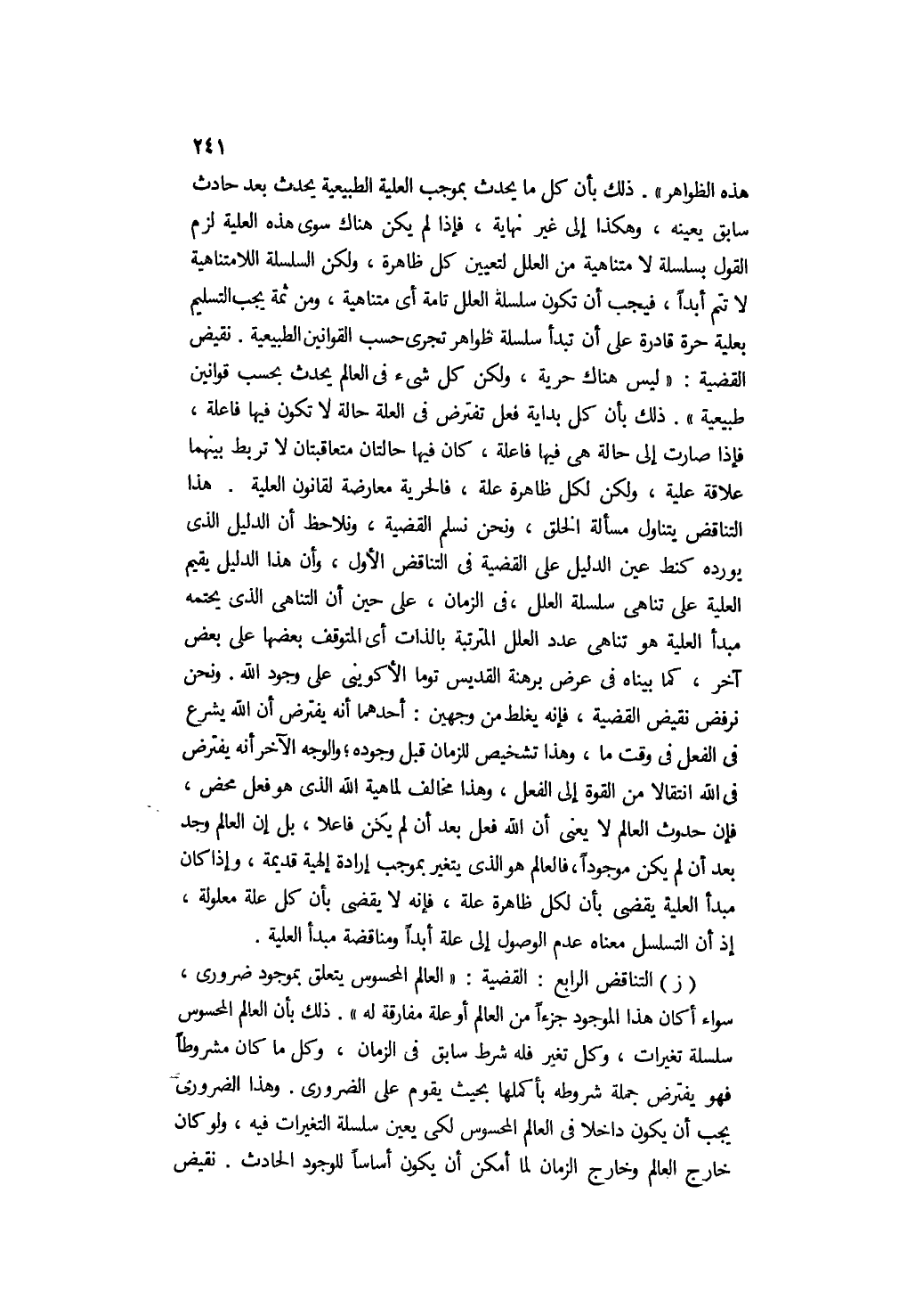 ز- التناقض الرابع: القضية: "العالم المحسوس يتعلق بموجود ضروري، سواء أكان هذا الموجود جزءًا من العالم أو علة مفارقة له" ذلك بأن العالم المحسوس سلسلة تغيرات، وكل تغير فله شرط سابق في الزمان, وكل ما كان مشروطًا فهو يفترض جملة شروطه بأكملها بحيث يقوم على الضروري. وهذا الضروري يجب أن يكون داخلًا في العالم المحسوس لكي يعين سلسلة التغيرات فيه، ولو كان خارج العالم وخارج الزمان لما أمكن أن يكون أساسًا للوجود الحادث. نقيض