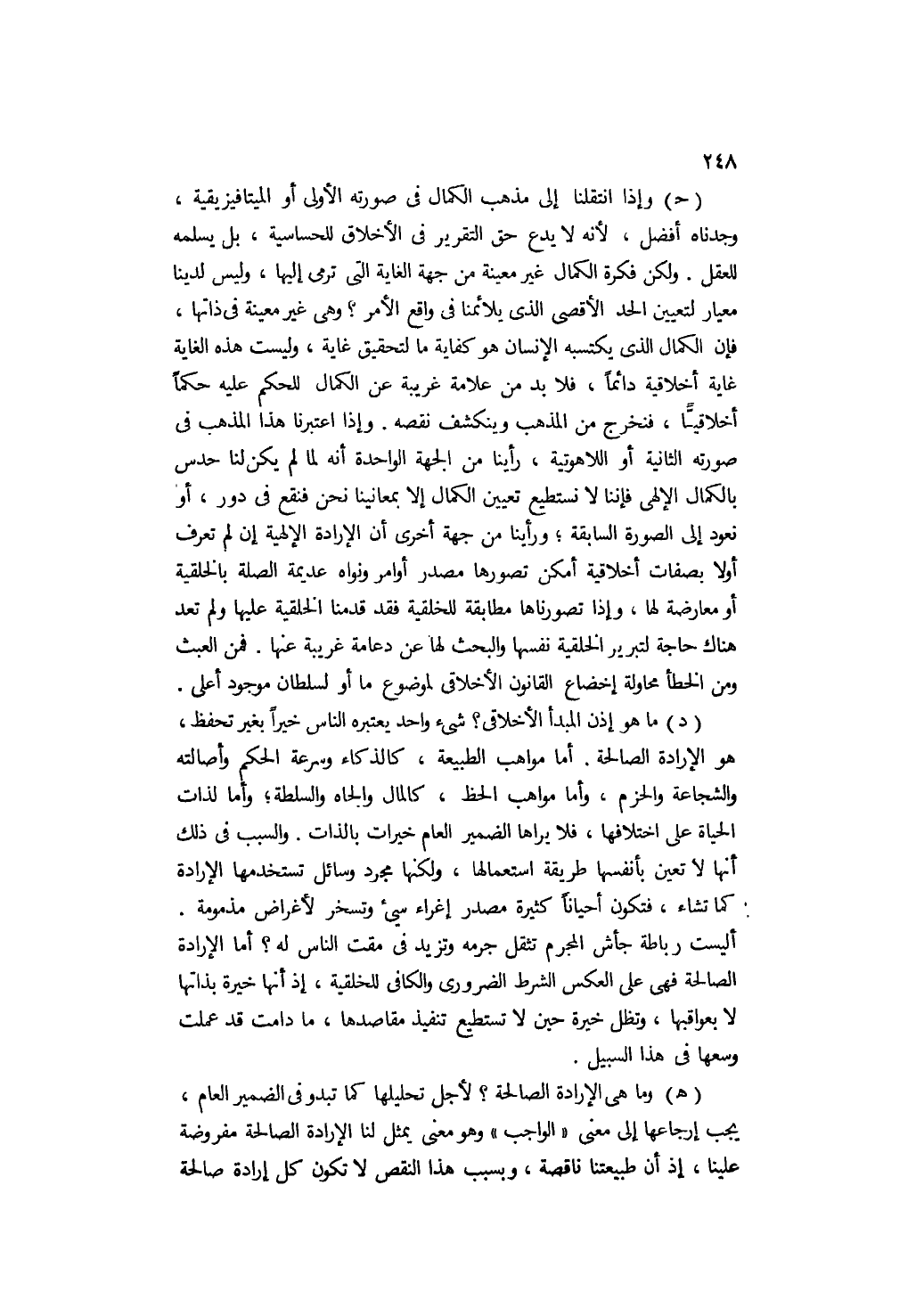 ج- وإذا انتقلنا إلى مذهب الكمال في صورته الأولى أو الميتافيزيقية، وجدناه أفضل؛ لأنه لا يدع حق التقرير في الأخلاق للحساسية، بل يسلمه للعقل. ولكن فكرة الكمال غير معينة من جهة الغاية التي ترمي إليها، وليس لدينا معيار لتعيين الحد الأقصى الذي يلائمنا في واقع الأمر, وهي غير معينة في ذاتها، فإن الكمال الذي يكتسبه الإنسان هو كفاية ما لتحقيق غاية، وليست هذه الغاية غاية أخلاقية دائمًا، فلا بد من علامة غريبة عن الكمال للحكم عليه حكمًا أخلاقيًّا. فنخرج من المذهب وينكشف نقصه. وإذا اعتبرنا هذا المذهب في صورته الثانية أو اللاهوتية، رأينا من الجهة الواحدة أنه لما لم يكن لنا حدس بالكمال الإلهي فإننا لا نستطيع تعيين الكمال إلا بمعانينا نحن فنقع في دور، أو نعود إلى الصورة السابقة، ورأينا من جهة أخرى أن الإرادة الإلهية إن لم تعرف أولًا بصفات أخلاقية أمكن تصورها مصدر أوامر ونواهٍ عديمة الصلة بالخلقية أو معارضة لها، وإذا تصورناها مطابقة للخلقية فقد قدمنا الخلقية عليها ولم تعد هناك حاجة لتبرير الخلقية نفسها والبحث لها عن دعامة غريبة عنها. فمن العبث ومن الخطأ محاولة إخضاع القانون الأخلاقي لموضوع ما أو لسلطان موجود أعلى.