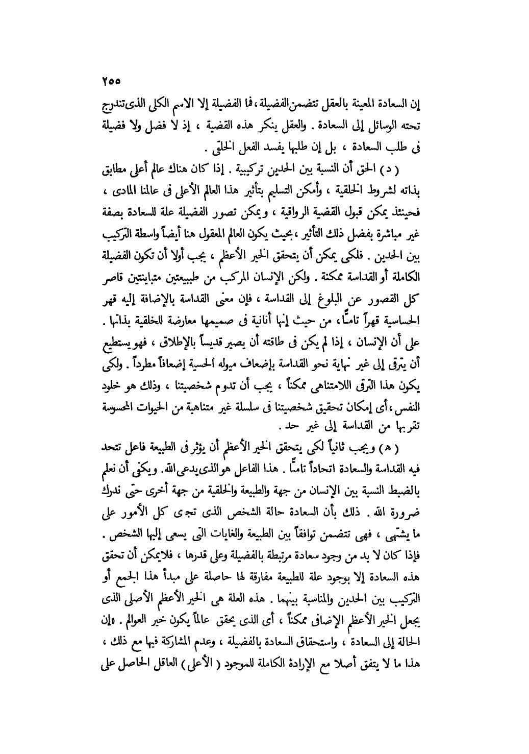 د- الحق أن النسبة بين الحدين تركيبية. إذا كان هناك عالم أعلى مطابق بذاته لشروط الخلقية، وأمكن التسليم بتأثير هذا العالم الأعلى في عالمنا المادي، فحينئذ يمكن قبول القضية الرواقية، ويمكن تصور الفضيلة علة للسعادة بصفة غير مباشرة بفضل ذلك التأثير، بحيث يكون العالم المعقول هنا أيضًا واسطة التركيب بين الحدين. فلكي يمكن أن يتحقق الخير الأعظم، يجب أولًا أن تكون الفضيلة الكاملة أو القداسة ممكنة. ولكن الإنسان المركب من طبيعتين متباينتين قاصر كل القصور عن البلوغ إلى القداسة، فإن معنى القداسة بالإضافة إليه قهر الحساسية قهرًا تامًّا, من حيث إنها أنانية في صميمها معارضة للخلقية بذاتها. على أن الإنسان، إذا لم يكن في طاقته أن يصير قديسًا بالإطلاق، فهو يستطيع أن يترقى إلى غير نهاية نحو القداسة بإضعاف ميوله الحسية إضعافًا مطردًا. ولكي يكون هذا الترقي اللامتناهي ممكنًا، يجب أن تدوم شخصيتنا، وذلك هو خلود النفس، أي: إمكان تحقيق شخصيتنا في سلسلة غير متناهية من الحيوات المحسوسة تقربها من القداسة إلى غير حد.