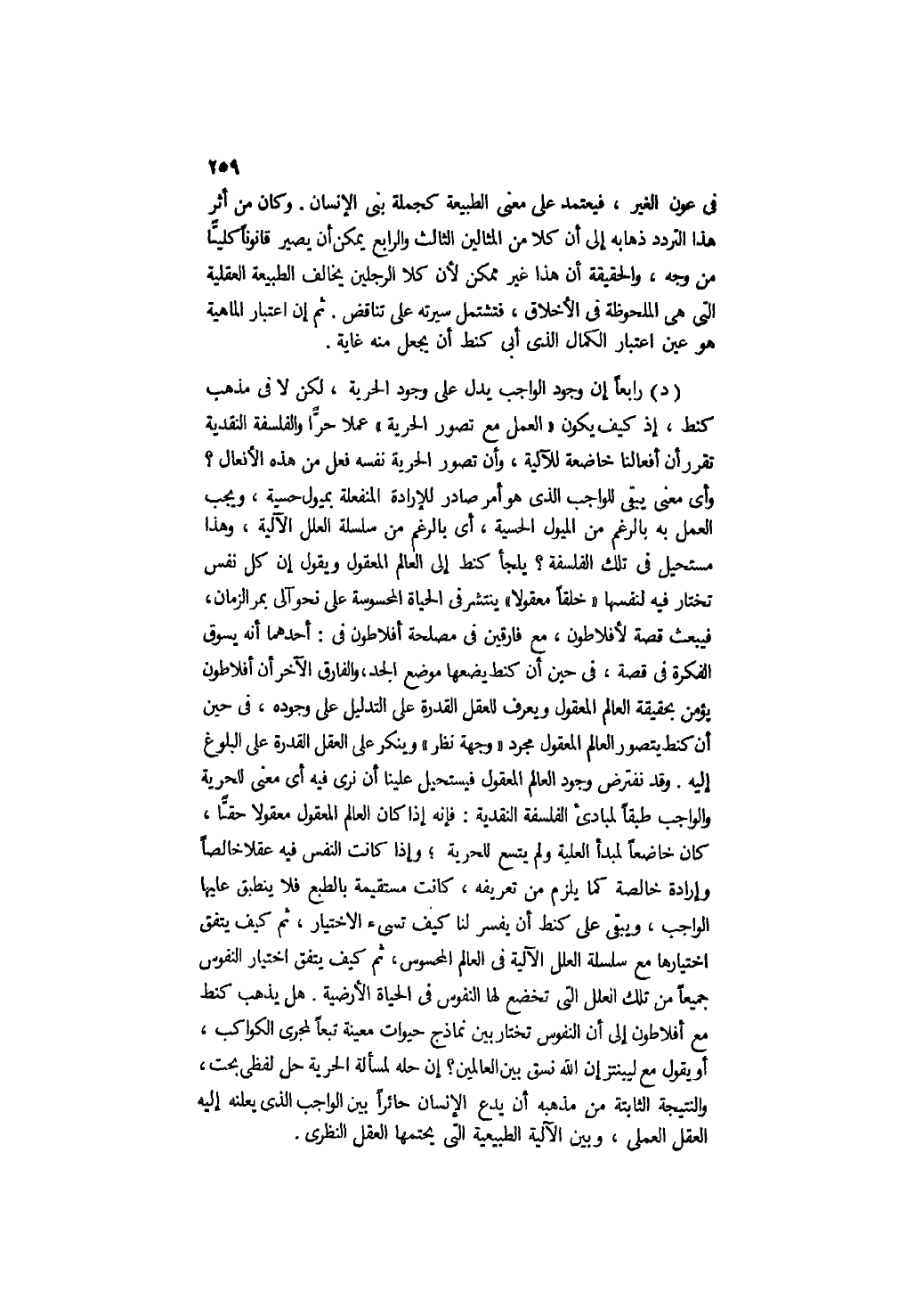 د- رابعًا: إن وجود الواجب يدل على وجود الحرية، لكن لا في مذهب كنط، إذ كيف يكون "العمل مع تصور الحرية" عملًا حرًّا والفلسفة النقدية تقرر أن أفعالنا خاضعة للآلية, وأن تصور الحرية نفسه فعل من هذه الأفعال؟ وأي معنى يبقى للواجب الذي هو أمر صادر للإرادة المنفعلة بميول حسية، ويجب العمل به بالرغم من الميول الحسية، أي: بالرغم من سلسلة العلل الآلية، وهذا مستحيل في تلك الفلسفة؟ يلجأ كنط إلى العالم المعقول ويقول: إن كل نفس تختار فيه لنفسها "خلقًا معقولًا" ينتشر في الحياة المحسوسة على نحو آلي بمر الزمان، فيبعث قصة لأفلاطون، مع فارقين في مصلحة أفلاطون؛ في أحدهما أنه يسوق الفكرة في قصة، في حين أن كنط يضعها موضع الجد، والفارق الآخر أن أفلاطون يؤمن بحقيقة العالم المعقول ويعرف للعقل القدرة على التدليل على وجوده، في حين أن كنط يتصور العالم المعقول مجرد "وجهة نظر" وينكر على العقل القدرة على البلوغ إليه. وقد نفترض وجود العالم المعقول فيستحيل علينا أن نرى فيه أي معنى للحرية والواجب طبقا لمبادئ الفلسفة النقدية, فإنه إذا كان العالم المعقول معقولا حقا، كان خاضعًا لمبدأ العلية ولم يتسع للحرية، وإذا كانت النفس فيه عقلًا خالصًا وإرادة خالصة كما يلزم من تعريفه، كانت مستقيمة بالطبع فلا ينطبق عليها الواجب، ويبقى على كنط أن يفسر لنا كيف تسيء الاختيار، ثم كيف يتفق اختيارها مع سلسلة العلل الآلية في العالم المحسوس، ثم كيف يتفق اختيار النفوس جميعًا من تلك العلل التي تخضع لها النفوس في الحياة الأرضية؟ هل يذهب كنط مع أفلاطون إلى أن النفوس تختار بين نماذج حيوات معينة تبعًا لمجرى الكواكب، أو يقول مع ليبنتز: إن الله نسق بين العالمين؟ إن حله لمسألة الحرية حل لفظي بحت، والنتيجة الثابتة من مذهبه أن يدع الإنسان حائرًا بين الواجب الذي يعلنه إليه العقل العملي، وبين الآلية الطبيعية التي يحتمها العقل النظري.