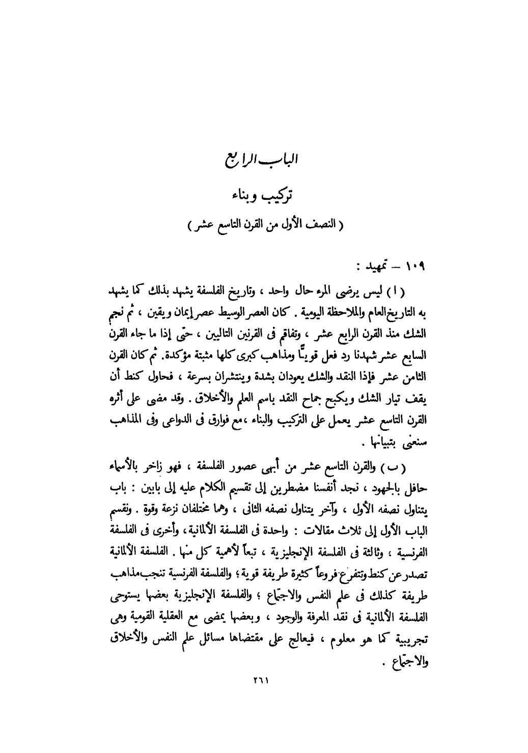 ب- والقرن التاسع عشر من أبهى عصور الفلسفة، فهو زاخر بالأسماء حافل بالجهود، نجد أنفسنا مضطرين إلى تقسيم الكلام عليه إلى بابين: باب يتناول نصفه الأول، وآخر يتناول نصفه الثاني، وهما مختلفان نزعة وقوة. ونقسم الباب الأول إلى ثلاث مقالات: واحدة في الفلسفة الألمانية، وأخرى في الفلسفة الفرنسية، وثالثة في الفلسفة الإنجليزية، تبعًا لأهمية كل منها. الفلسفة الألمانية تصدر عن كنط وتتفرع فروعًا كثيرة طريفة قوية؛ والفلسفة الفرنسية تنجب مذاهب طريفة كذلك في علم النفس والاجتماع؛ والفلسفة الإنجليزية بعضها يستوحي الفلسفة الألمانية في نقد المعرفة والوجود، وبعضها يمضي مع العقلية القومية وهي تجريبية كما هو معلوم، فيعالج على مقتضاها مسائل علم النفس والأخلاق والاجتماع.