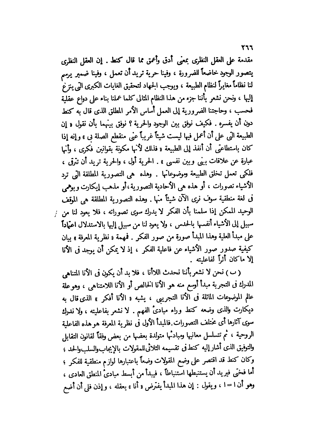مقدمة على العقل النظري بمعنى أدق وأعمق مما قال كنط. إن العقل النظري يتصور الوجود خاضعًا للضرورة, وفينا حرية تريد أن تعمل، وفينا ضمير يرسم لنا نظامًا مغايرًا لنظام الطبيعة، ويوجب الجهاد لتحقيق الغايات الكبرى التي ينزع إليها، ونحن نشعر بأننا جزء من هذا النظام المثالي كلما عملنا بناء على دواعٍ عقلية فحسب، وحاجتنا الضرورية إلى العمل أساس الأمر المطلق الذي قال به كنط دون أن يفسره, فكيف نوفق بين الوجود والحرية؟ نوفق بينهما بأن نقول: "إن الطبيعة التي عليَّ أن أعمل فيها ليست شيئًا غريبًا عني, منقطع الصلة بي" وإنه إذا كان باستطاعتي أن أنفذ إلى الطبيعة "فذلك لأنها مكونة بقوانين فكري، وأنها عبارة عن علاقات بيني وبين نفسي". الحرية أولا، والحرية تريد أن تترقى، فلكي تعمل تخلق الطبيعة وموضوعاتها. وهذه هي التصورية المطلقة التي ترد الأشياء تصورات، أو هذه هي الأحادية التصورية، أو مذهب ديكارت وبوهمي في لغة منطقية سوف نرى الآن شيئًا منها. وهذه التصورية المطلقة هي الموقف الوحيد الممكن إذا سلمنا بأن الفكر لا يدرك سوى تصوراته، فلا يعود لنا من سبيل إلى الأشياء أنفسها بالحدس، ولا يعود لنا من سبيل إليها بالاستدلال اعتمادًا على مبدأ العلية, وهذا المبدأ صورة من صور الفكر. فمهمة "نظرية المعرفة" بيان كيفية صدور صور الأشياء عن فاعلية الفكر، إذ لا يمكن أن يوجد في الأنا إلا ما كان أثرًا لفاعليته.