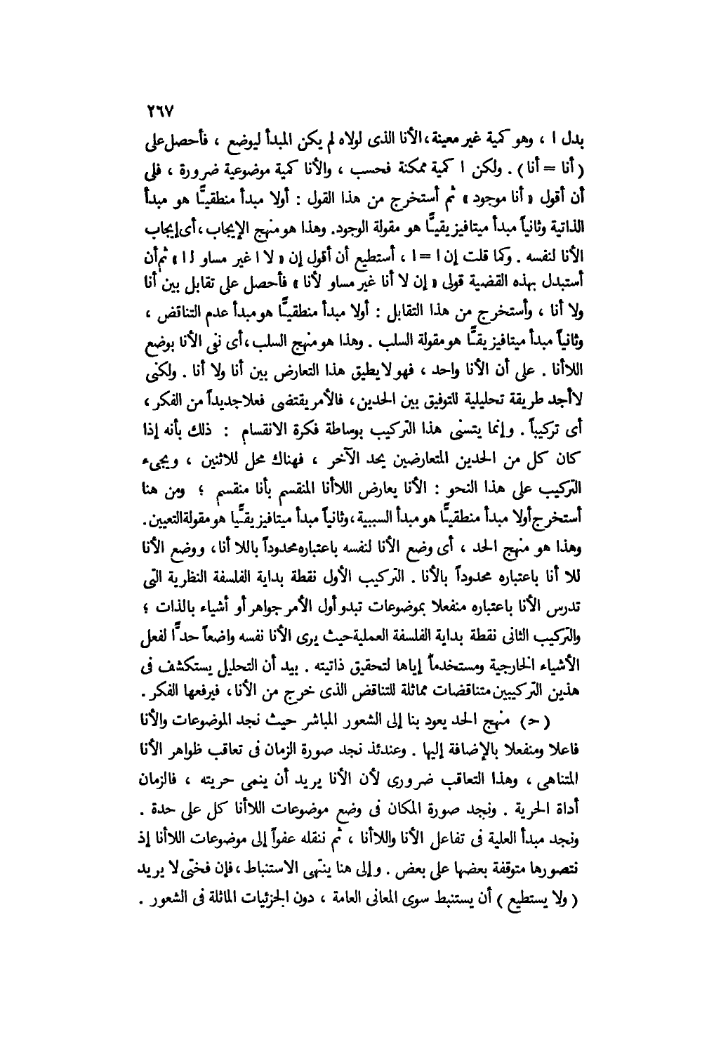 بدل ا، وهو كمية غير معينة، الأنا الذي لولاه لم يكن المبدأ ليوضع, فأحصل على "أنا=أنا". ولكن اكمية ممكنة فحسب، والأنا كمية موضوعية ضرورة، فلي أن أقول: "أنا موجود" ثم أستخرج من هذا القول أولًا مبدأً منطقيًّا هو مبدأ الذاتية, وثانيًا مبدأً ميتافيزيقيًّا هو مقولة الوجود. وهذا هو منهج الإيجاب، أي: إيجاب الأنا لنفسه. وكما قلت: إن ا=ا، أستطيع أن أقول: إن "لا اغير مساوٍ لـ ا" ثم أن أستبدل بهذه القضية قولي: "إن لاأنا عير مساوٍ لأنا" فأحصل على تقابل بين أنا ولاأنا، وأستخرج من هذا التقابل أولًا مبدأ منطقيا هو مبدأ عدم التناقض، وثانيًا مبدأ ميتافيزيقيا هو مقولة السلب. وهذا هو منهج السلب، أي: نفي الأنا بوضع اللاأنا. على أن الأنا واحد، فهو لا يطيق هذا التعارض بين أنا ولاأنا. ولكني لا أجد طريقة تحليلية للتوفيق بين الحدين، فالأمر يقتضي فعلا جديدا من الفكر، أي: تركيبا. وإنما يتسنى هذا التركيب بوساطة فكرة الانقسام؛ ذلك بأنه إذا كان كل من الحدين المتعارضين يحد الآخر، فهناك محل للاثنين، ويجيء التركيب على هذا النحو: الأنا يعارض اللاأنا المنقسم بأنا منقسم؛ ومن هنا أستخرج أولًا مبدأ منطقيًّا هو مبدأ السببية، وثانيًا مبدأ ميتافيزيقيًّا هو مقولة التعيين. وهذا هو منهج الحد، أي: وضع الأنا لنفسه باعتباره محدودًا باللاأنا، ووضع الأنا للاأنا باعتباره محدودًا بالأنا. التركيب الأول نقطة بداية الفلسفة النظرية التي تدرس الأنا باعتباره منفعلًا بموضوعات تبدو أول الأمر جواهر أو أشياء بالذات؛ والتركيب الثاني نقطة بداية الفلسفة العملية حيث يرى الأنا نفسه واضعًا حدًّا لفعل الأشياء الخارجية ومستخدمًا إياه لتحقيق ذاتيته. بيد أن التحليل يستكشف في هذين التركيبين متناقضات مماثلة للتناقض الذي خرج من الأنا، فيرفعها الفكر.