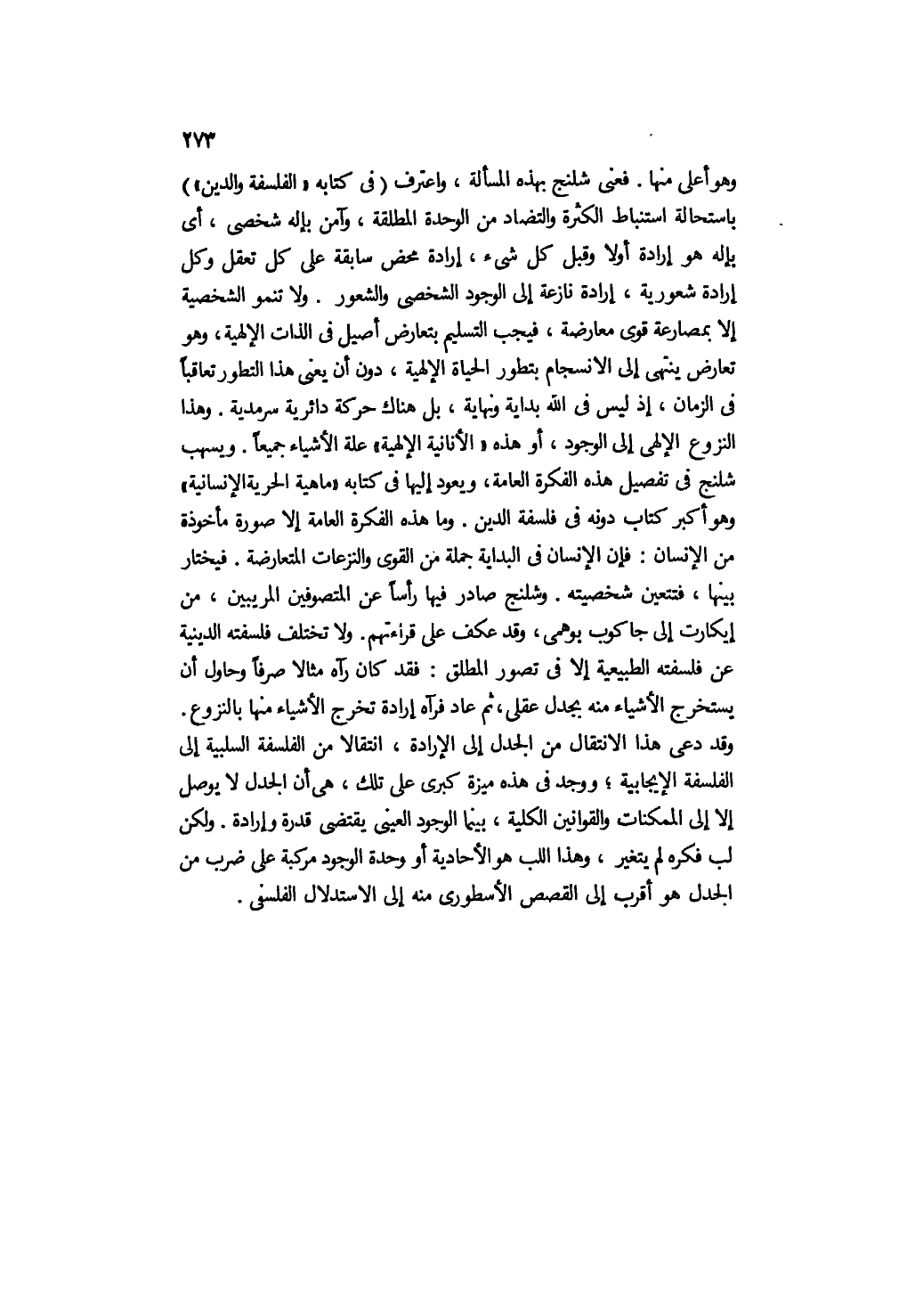 وهو أعلى منها. فعني شلنج بهذه المسألة، واعترف "في كتابه "الفلسفة والدين"" باستحالة استنباط الكثرة والتضاد من الوحدة المطلقة، وآمن بإله شخصي، أي: بإله هو إرادة أولًا وقبل كل شيء، إرادة محض سابقة على كل تعقل وكل إرادة شعورية، إرادة نازعة إلى الوجود الشخصي والشعور. ولا تنمو الشخصية إلا بمصارعة قوى معارضة، فيجب التسليم بتعارض أصيل في الذات الإلهية، وهو تعارض ينتهي إلى الانسجام بتطور الحياة الإلهية، دون أن يعني هذا التطور تعاقبًا في الزمان، إذ ليس في الله بداية ونهاية، بل هناك حركة دائرية سرمدية. وهذا النزوع الإلهي إلى الوجود، أو هذه "الأنانية الإلهية" علة الأشياء جميعًا. ويسهب شلنج في تفصيل هذه الفكرة العامة، ويعود إليها في كتابه "ماهية الحرية الإنسانية" وهو أكبر كتاب دوّنه في فلسفة الدين. وما هذه الفكرة العامة إلا صورة مأخوذة من الإنسان, فإن الإنسان في البداية جملة من القوى والنزعات المتعارضة. فيختار بينها، فتتعين شخصيته. وشلنج صادر فيها رأسًا عن المتصوفين المريبين، من ديكارت إلى جاكوب بوهمي، وقد عكف على قراءتهم. ولا تختلف فلسفته الدينية عن فلسفته الطبيعية إلا في تصور المطلق؛ فقد كان رآه مثالًا صرفًا وحاول أن يستخرج الأشياء منه بجدل عقلي، ثم عاد فرآه إرادة تخرج الأشياء منها بالنزوع. وقد دعا هذا الانتقال من الجدل إلى الإرادة، انتقالا من الفلسفة السلبية إلى الفلسفة الإيجابية؛ ووجد في هذه ميزة كبرى على تلك، هي أن الجدل لا يوصل إلا إلى الممكنات والقوانين الكلية، بينما الوجود العيني يقتضي قدرة وإرادة. ولكن لب فكره لم يتغير، وهذا اللب هو الأحادية أو وحدة الوجود مركبة على ضرب من الجدل هو أقرب إلى القصص الأسطوري منه إلى الاستدلال الفلسفي.