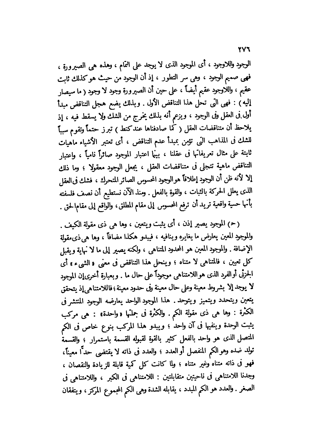 ج- الموجود يصير إذن، أي: يثبت ويتعين، وها هي ذي مقولة الكيف: والموجود المعين يعارض ما يغايره وينافيه، فيبدو هكذا مضافًا، وها هي ذي مقولة الإضافة: والموجود المعين هو المحدود المتناهي، ولكنه يصير إلى ما لانهاية ويقبل كل تعيين، فالمتناهي لامتناهٍ؛ وينحل هذا التناقض في معنى "الشيء" أي: الجزئي أو الفرد الذي هو اللامتناهي موجودًا على حال ما. وبعبارة أخرى: إن الموجود لا يوجد إلا بشروط معينة وعلى حال معينة وفي حدود معينة, فاللامتناهي إذ يتحقق يتعين ويتحدد ويتميز ويتوحد. هذا الموجود الواحد يعارضه الوجود المنتشر في الكثرة, وها هي ذي مقولة الكم: والكثرة في جملتها "واحدة" هي مركب يثبت الوحدة وينفيها في آن واحد؛ ويبدو هذا المركب بنوع خاص في الكم المتصل الذي هو واحد بالفعل, كثير بالقوة لقبوله القسمة باستمرار؛ والقسمة تولد ضده وهو الكم المنفصل أو العدد؛ والعدد في ذاته لا يقتضي حدا معينا, فهو في ذاته متناه وغير متناه؛ ولما كانت كل كمية قابلة للزيادة والنقصان، وجدنا اللامتناهي في ناحيتين متقابلتين: اللامتناهي في الكبر، واللامتناهي في الصغر. والعدد هو الكم المبدد، يقابله الشدة وهي الكم المجموع المركز، ويتفقان