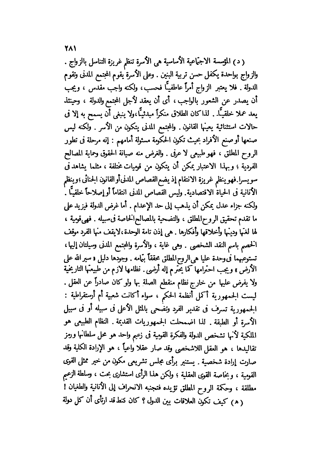 د- المؤسسة الاجتماعية الأساسية هي الأسرة تنظم غريزة التناسل بالزواج, والزواج بواحدة يكفل حسن تربية البنين. وعلى الأسرة يقوم المجتمع المدني وتقوم الدولة, فلا يعتبر الزواج أمرًا عاطفيًّا فحسب، ولكنه واجب مقدس, ويجب أن يصدر عن الشعور بالواجب، أي: أن يعقد لأجل المجتمع والدولة، وحينئذ يعد عملًا خلقيًّا. لذا كان الطلاق منكرا مبدئيا، ولا ينبغي أن يسمح به إلا في حالات استثنائية يعينها القانون. والمجتمع المدني يتكون من الأسر, ولكنه ليس صنعها أو صنع الأفراد بحيث تكون الحكومة مسئولة أمامهم. إنه مرحلة في تطور الروح المطلق، فهو طبيعي لا عرفي, والغرض منه صيانة الحقوق وحماية المصالح الفردية؛ وبهذا الاعتبار يمكن أن يتكون من قوميات مختلفة، مثلما يشاهد في سويسرا. فهو ينظم غريزة الانتقام إذ يضع القصاص المدني أو القانون الجنائي؛ وينظم الأنانية في الحياة الاقتصادية. وليس القصاص المدني انتقامًا أو إصلاحًا خلقيًّا, ولكنه جزاء عدل يمكن أن يذهب إلى حد الإعدام. أما غرض الدولة فيزيد على ما تقدم تحقيق الروح المطلق، والتضحية بالمصالح الخاصة في سبيله. فهي قومية، لها لغتها ودينها وأخلاقها وأفكارها. هي إذن تامة الوحدة، لا يقف منها الفرد موقف الخصم باسم النقد الشخصي, وهي غاية، والأسرة والمجتمع المدني وسيلتان إليها، تستوعبهما في وحدة عليا هي الروح المطلق محققًا بتمامه. وجودها دليل "سير الله على الأرض" ويجب احترامها كما يحترم إله أرضي. نظامها لازم من طبيعتها التاريخية ولا يفرض عليها من خارج نظام منقطع الصلة بها ولو كان صادرًا عن العقل.