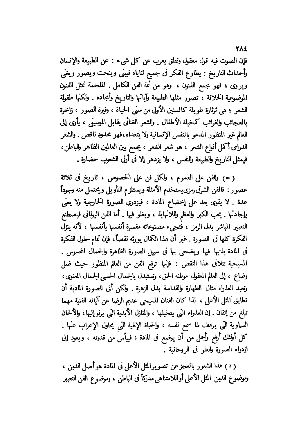 ج- وللفن على العموم، ولكل فن على الخصوص، تاريخ في ثلاثة عصور: فالفن الشرقي رمزي يستخدم الأمثلة ويستلزم التأويل ويحتمل منه وجودًا عدة. لا يقوى بعد على إخضاع المادة، فيزدري الصورة الخارجية ولا يعنى بإجادتها. يحب الكبر والعظم واللانهاية، ويغلو فيها. أما الفن اليوناني فيصطنع التعبير المباشر بدل الرمز، فتجيء مصنوعاته مفسرة أنفسها بأنفسها؛ لأنه ينزل الفكرة كلها في الصورة. غير أن هذا الكمال يورثه نقصًا، فإن تمام حلول الفكرة في المادة يفنيها فيها ويضحي بها في سبيل الصورة الظاهرة والجمال المحسوس. المسيحية تتلافى هذا النقص, فإنها ترفع الفن من العالم المنظور حيث ضل وضاع، إلى العالم المعقول موطنه الحق، وتستبدل بالجمال الحسي الجمال المعنوي، وتعبد العذراء مثال الطهارة والقداسة بدل الزهرة. ولكن أنى للصورة المادية أن تطابق المثل الأعلى؛ لذا كان الفنان المسيحي عديم الرضا عن آياته الفنية مهما تبلغ من إتقان. إن العذراء التي يتخيلها، والمنازل الأبدية التي يرنو إليها، والألحان السماوية التي يرهف لها سمع نفسه، والحياة الإلهية التي يحاول الإعراب عنها, كل أولئك أرفع وأجمل من أن يوضع في المادة؛ فييأس من قدرته، ويعود إلى ازدراء الصورة والغلو في الروحانية.