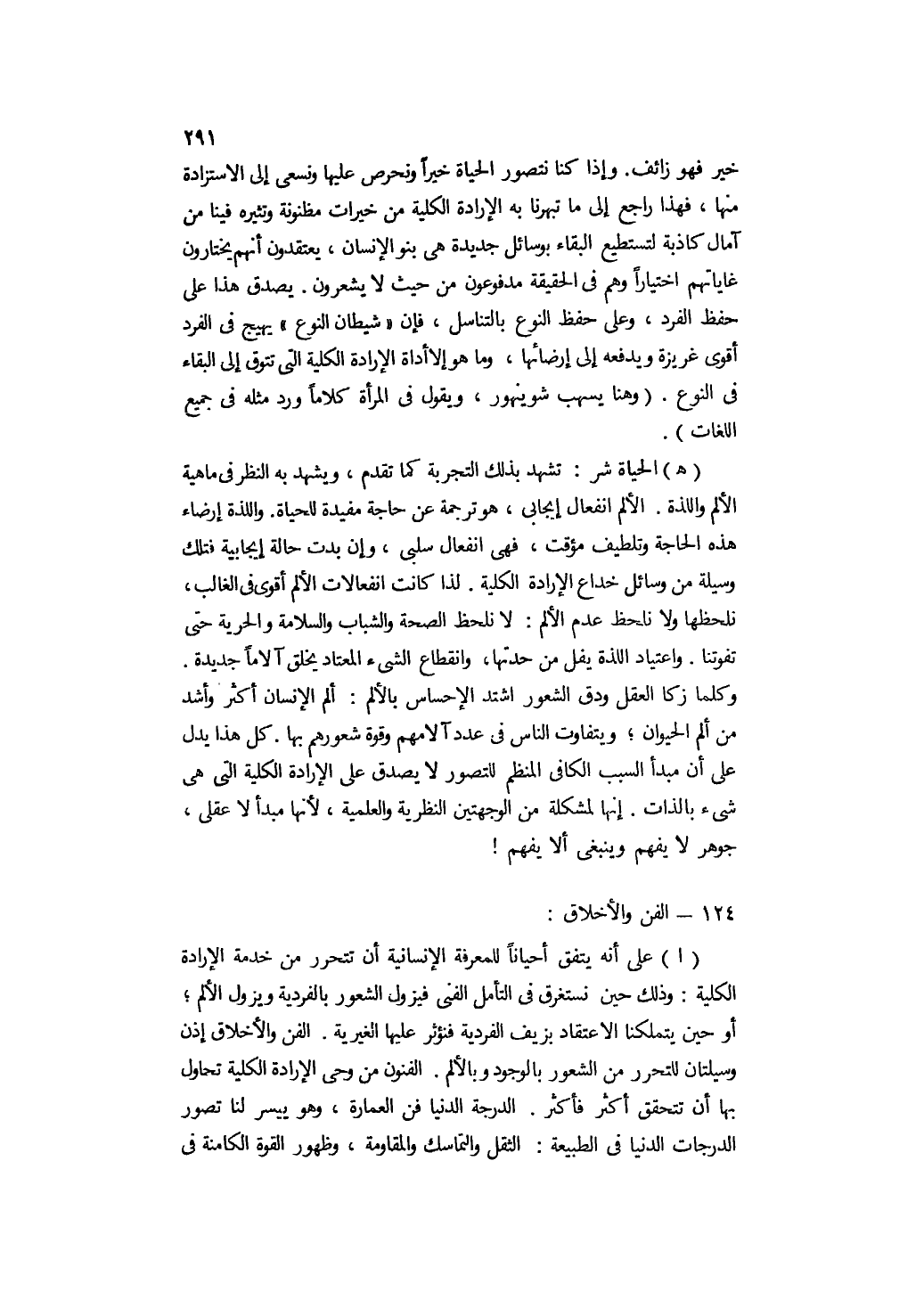 هـ- الحياة شر: تشهد بذلك التجربة كما تقدم، ويشهد به النظر في ماهية الألم واللذة. والألم انفعال إيجابي، هو ترجمة عن حاجة مفيدة للحياة. واللذة إرضاء هذه الحاجة وتلطيف مؤقت، فهي انفعال سلبي، وإن بدت حالة إيجابية فتلك وسيلة من وسائل خداع الإرادة الكلية؛ لذا كانت انفعالات الألم أقوى في الغالب، نلحظها ولا نلحظ عدم الألم: لا نلحظ الصحة والشباب والسلامة والحرية حتى تفوتنا. واعتياد اللذة يفل من حدتها، وانقطاع الشيء المعتاد يخلق آلامًا جديدة. وكلما زكا العقل ودق الشعور اشتدَّ الإحساس بالألم: ألم الإنسان أكثر وأشد من ألم الحيوان؛ ويتفاوت الناس في عدد آلامهم وقوة شعورهم بها. كل هذا يدل على أن مبدأ السبب الكافي المنظم للتصور لا يصدق على الإرادة الكلية التي هي شيء بالذات. إنها لمشكلة من الوجهتين النظرية والعلمية؛ لأنها مبدأ لاعقلي، جوهر لا يفهم وينبغي ألا يفهم!