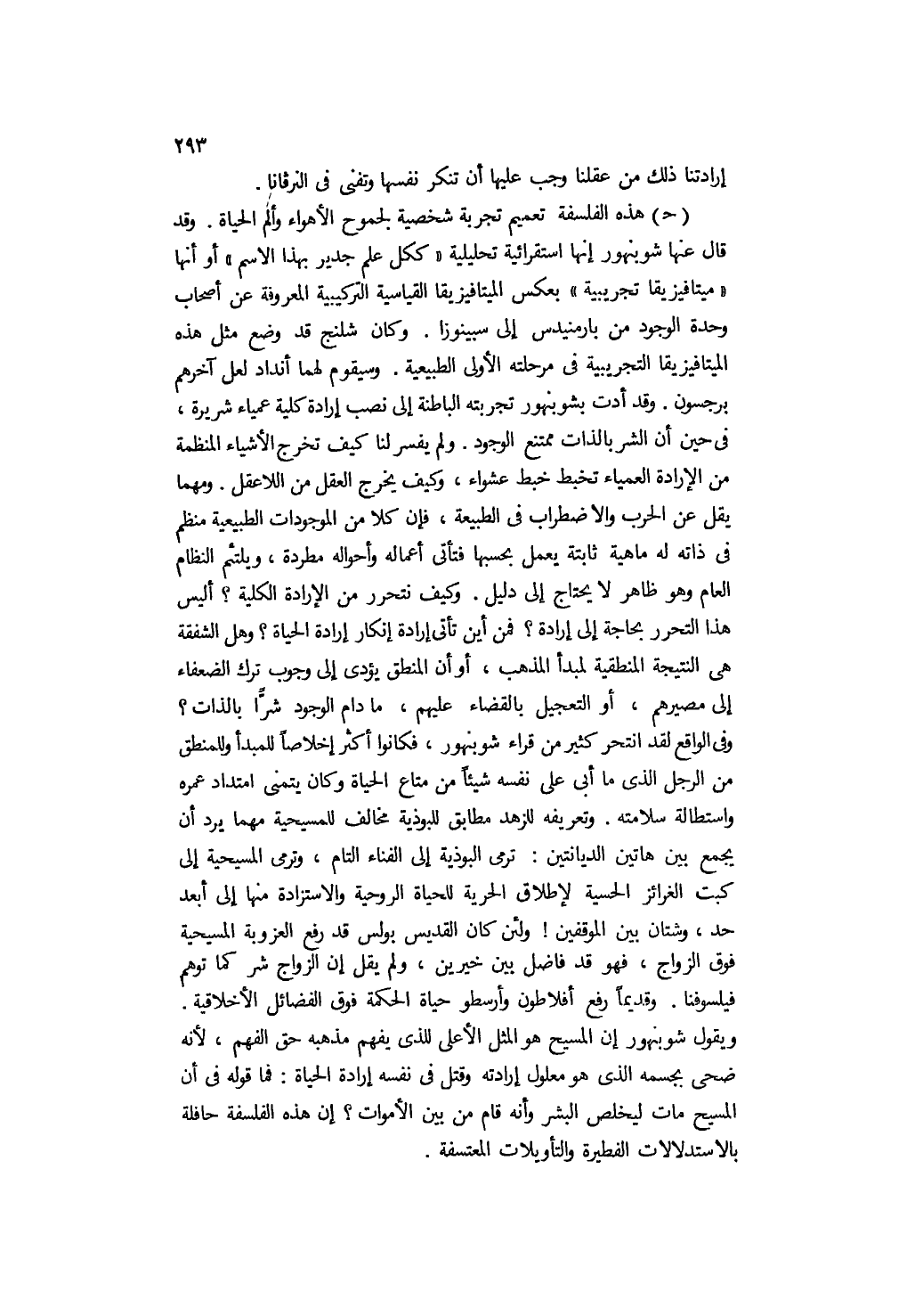 ج- هذه الفلسفة تعميم تجربة شخصية لجموح الأهواء وألم الحياة. وقد قال عنها شوبنهور: إنها استقرائية تحليلية "ككل علم جدير بهذا الاسم" أو إنها "ميتافيزيقا تجريبية" بعكس الميتافيزيقا القياسية التركيبية المعروفة عن أصحاب وحدة الوجود من بارمنيدس إلى سبينوزا. وكان شلنج قد وضع مثل هذه الميتافيزيقا التجريبية في مرحلته الأولى الطبيعية, وسيقوم لهما أنداد لعل آخرهم برجسون. وقد أدت بشوبنهور تجربته الباطنة إلى نصب إرادة كلية عمياء شريرة، في حين أن الشر بالذات ممتنع الوجود. ولم يفسر لنا كيف تخرج الأشياء المنظمة من الإرادة العمياء تخبط خبط عشواء، وكيف يخرج العقل من اللاعقل. ومهما يقل عن الحرب والاضطراب في الطبيعة، فإن كلا من الموجودات الطبيعية منظم في ذاته له ماهية ثابتة يعمل بحسبها, فتأتي أعماله وأحواله مطردة، ويلتئم النظام العام وهو ظاهر لا يحتاج إلى دليل. وكيف نتحرر من الإرادة الكلية؟ أليس هذا التحرر بحاجة إلى إرادة؟ فمن أين تأتي إرادة إنكار إرادة الحياة؟ وهل الشفقة هي النتيجة المنطقية لمبدأ المذهب، أو أن المنطق يؤدي إلى وجوب ترك الضعفاء إلى مصيرهم، أو التعجيل بالقضاء عليهم، ما دام الوجود شرا بالذات؟ وفي الواقع, لقد انتحر كثير من قراء شوبنهور، فكانوا أكثر إخلاصًا للمبدأ وللمنطق من الرجل الذي ما أبى على نفسه شيئًا من متاع الحياة, وكان يتمنى امتداد عمره واستطالة سلامته. وتعريفه للزهد مطابق للبوذية, مخالف للمسيحية مهما يرد أن يجمع بين هاتين الديانتين: ترمي البوذية إلى الفناء التام، وترمي المسيحية إلى كبت الغرائز الحسية لإطلاق الحرية للحياة الروحية والاستزادة منها إلى أبعد حد، وشتان بين الموقفين! ولئن كان القديس بولس قد رفع العزوبة المسيحية فوق الزواج، فهو قد فاضل بين خيرين، ولم يقل: إن الزواج شر كما توهم فيلسوفنا. وقديمًا رفع أفلاطون وأرسطو حياة الحكمة فوق الفضائل الأخلاقية. ويقول شوبنهور: إن المسيح هو المثل الأعلى للذي يفهم مذهبه حق الفهم؛ لأنه ضحى بجسمه الذي هو معلول إرادته, وقتل في نفسه إرادة الحياة, فما قوله في أن المسيح مات ليخلص البشر وأنه قام من بين الأموات؟ إن هذه الفلسفة حافلة بالاستدلالات الفطيرة والتأويلات المعتسفة.