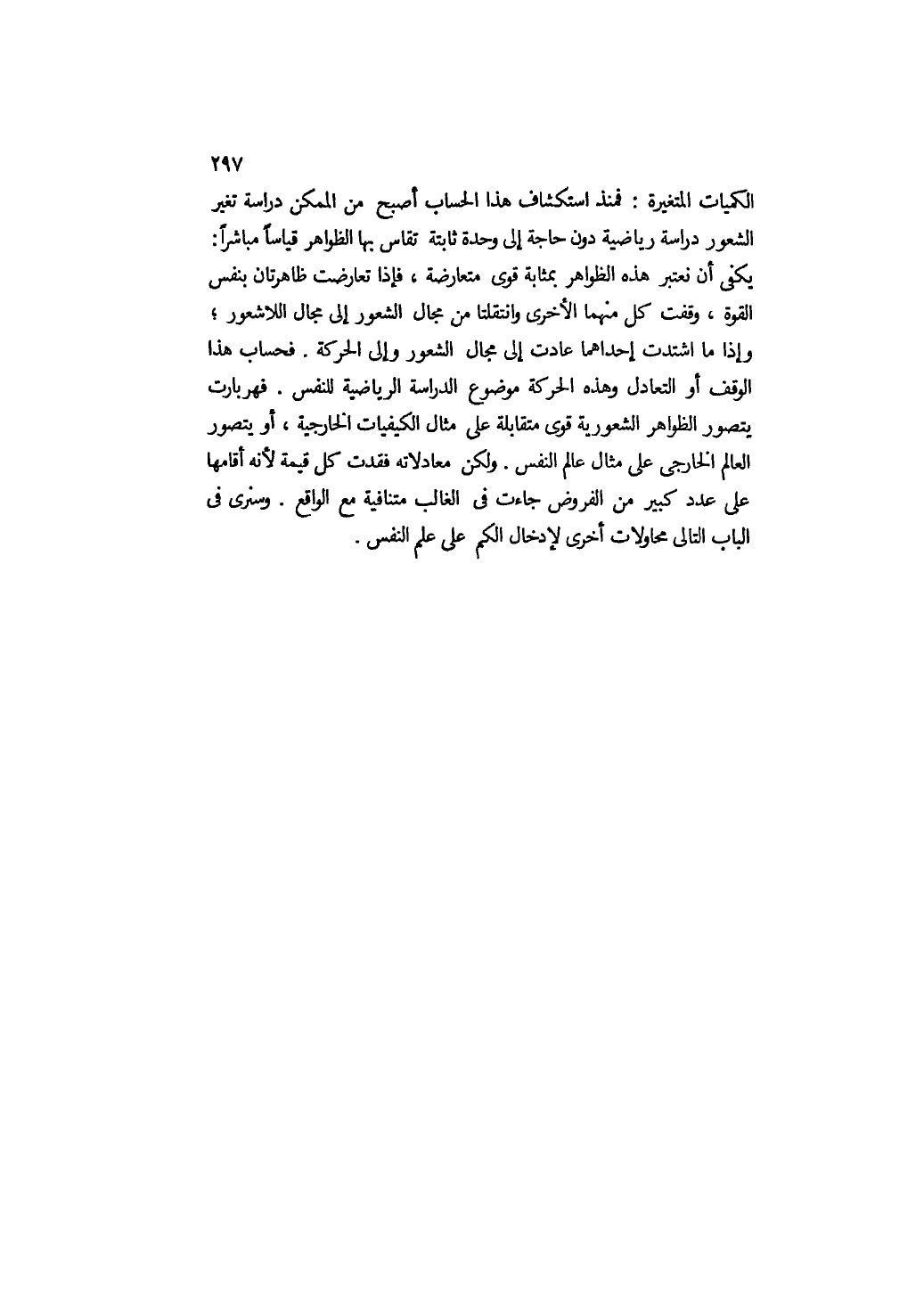 الكميات المتغيرة. فمنذ استكشاف هذا الحساب أصبح من الممكن دراسة تغير الشعور دراسة رياضية دون حاجة إلى وحدة ثابتة تقاس بها الظواهر قياسًا مباشرًا. يكفي أن نعتبر هذه الظواهر بمثابة قوى متعارضة، فإذا تعارضت ظاهرتان بنفس القوة، وقفت كل منهما الأخرى وانتقلتا من مجال الشعور إلى مجال اللاشعور؛ وإذا ما اشتدت إحداهما عادت إلى مجال الشعور وإلى الحركة. فحساب هذا الوقف أو التعادل وهذه الحركة موضوع الدراسة الرياضية للنفس. فهربارت يتصور الظواهر الشعورية قوى متقابلة على مثال الكيفيات الخارجية، أو يتصور العالم الخارجي على مثال عالم النفس, ولكن معادلاته فقدت كل قيمة لأنه أقامها على عدد كبير من الفروض جاءت في الغالب متنافية مع الواقع. وسنرى في الباب التالي محاولات أخرى لإدخال الكم على علم النفس.