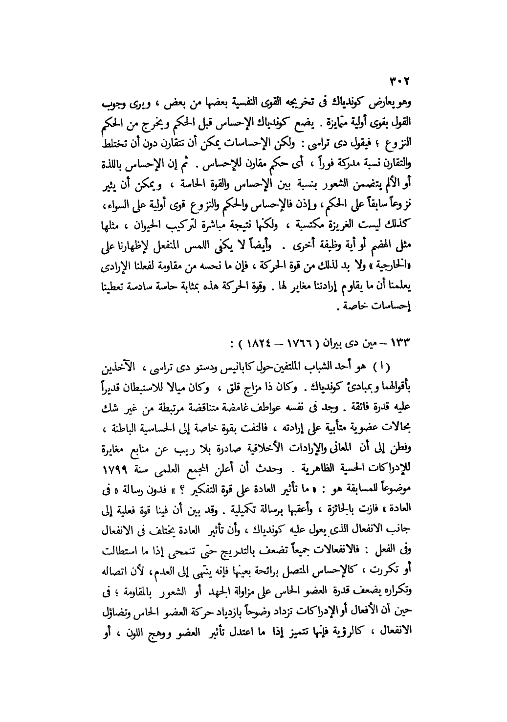 أ- هو أحد الشباب الملتفين حول كابانيس ودستو دي تراسي، الآخذين بأقوالهما وبمبادئ كوندياك. وكان ذا مزاج قلق, وكان ميالًا للاستبطان قديرًا عليه قدرة فائقة. وجد في نفسه عواطف غامضة متناقضة مرتبطة من غير شك بحالات عضوية متأبية على إرادته، فالتفت بقوة خاصة إلى الحساسية الباطنة، وفطن إلى أن المعاني والإرادات الأخلاقية صادرة بلا ريب عن منابع مغايرة للإدراكات الحسية الظاهرية. وحدث أن أعلن المجمع العلمي سنة 1799 موضوعًا للمسابقة هو: "ما تأثير العادة على قوة التفكير؟ " فدون رسالة "في العادة" فازت بالجائزة، وأعقبها برسالة تكميلية. وقد بين أن فينا قوة فعلية إلى جانب الانفعال الذي يعول عليه كوندياك، وأن تأثير العادة يختلف في الانفعال وفي الفعل؛ فالانفعالات جميعًا تضعف بالتدريج حتى تنمحي إذا ما استطالت أو تكررت، كالإحساس المتصل برائحة بعينها فإنه ينتهي إلى العدم؛ لأن اتصاله وتكراره يضعف قدرة العضو الحاس على مزاولة الجهد أو الشعور بالمقاومة؛ في حين أن الأفعال أو الإدراكات تزداد وضوحًا بازدياد حركة العضو الحاسّ وتضاؤل الانفعال كالرؤية, فإنها تتميز إذا ما اعتدل تأثير العضو ووهج اللون، أو