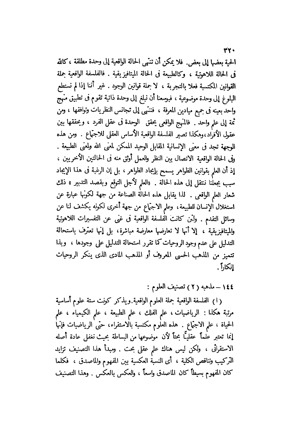 الحية بعضها إلى بعض. فلا يمكن أن تنتهي الحالة الواقعية إلى وحدة مطلقة، كالله في الحالة اللاهوتية، وكالطبيعة في الحالة الميتافيزيقية. فالفلسفة الواقعية جملة القوانين المكتسبة فعلا بالتجربة, لا جملة قوانين الوجود. غير أننا إذا لم نستطع البلوغ إلى وحدة موضوعية، فبوسعنا أن نبلغ إلى وحدة ذاتية تقوم في تطبيق منهج واحد بعينه في جميع ميادين المعرفة، فننتهي إلى تجانس النظريات وتوافقها، ومن ثمة إلى علم واحد. فالمنهج الواقعي يحقق الوحدة في عقل الفرد، ويحققها بين عقول الأفراد، وهكذا تصير الفلسفة الواقعية الأساس العقلي للاجتماع. ومن هذه الوجهة تجد في معنى الإنسانية المقابل الوحيد الممكن لمعنى الله ولمعنى الطبيعة. وفي الحالة الواقعية الاتصال بين النظر والعمل أوثق منه في الحالتين الأخريين، إذ إن العلم بقوانين الظواهر يسمح بإيجاد الظواهر، بل إن الرغبة في هذا الإيجاد سبب يجعلنا ننتقل إلى هذه الحالة. "العلم لأجل التوقع وبقصد التدبير" ذلك شعار العلم الواقعي؛ لذا يقابل هذه الحالة الصناعة من جهة لكونها عبارة عن استغلال الإنسان للطبيعة، وعلم الاجتماع من جهة أخرى لكونه يكشف لنا عن وسائل التقدم. ولئن كانت الفلسفة الواقعية في غنى عن التفسيرات اللاهوتية والميتافيزيقية، إلا أنها لا تعارضها معارضة مباشرة، بل إنها تعترف باستحالة التدليل على عدم وجود الروحيات كما تقرر استحالة التدليل على وجودها، وبذا تتميز من المذهب الحسي المعروف أو المذهب المادي الذي ينكر الروحيات إنكارًا.