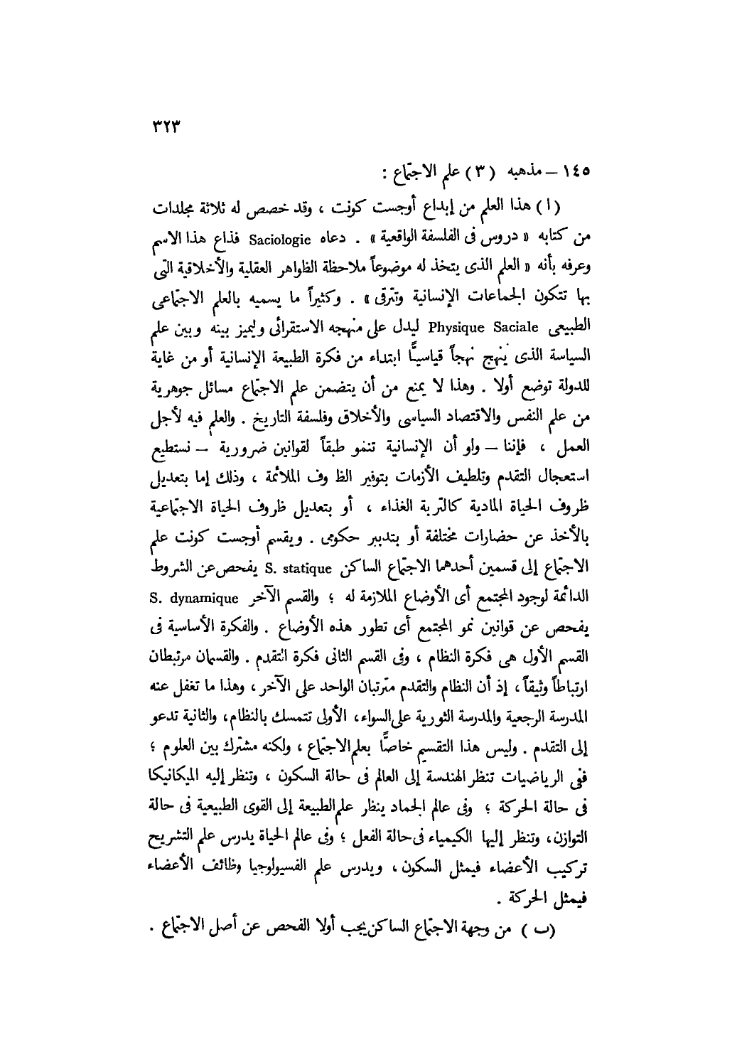 أ- هذا العلم من إبداع أوجست كونت، وقد خصَّص له ثلاثة مجلدات من كتابه "دروس في الفلسفة الواقعية". دعاه Saciologie فذاع هذا الاسم وعرفه بأنه "العلم الذي يتخذ له موضوعًا ملاحظة الظواهر العقلية والأخلاقية التي بها تتكون الجماعات الإنسانية وتترقى". وكثيرًا ما يسميه بالعلم الاجتماعي الطبيعي Physique Saciale ليدل على منهجه الاستقرائي وليميز بينه وبين علم السياسة الذي ينهج نهجًا قياسيًّا ابتداء من فكرة الطبيعة الإنسانية, أو من غاية للدولة توضع أولًا. وهذا لا يمنع من أن يتضمن علم الاجتماع مسائل جوهرية من علم النفس والاقتصاد السياسي والأخلاق وفلسفة التاريخ. والعلم فيه لأجل العمل، فإننا -ولو أن الإنسانية تنمو طبقًا لقوانين ضرورية- نستطيع استعجال التقدم وتلطيف الأزمات بتوفير الظروف الملائمة، وذلك إما بتعديل ظروف الحياة المادية كالتربة الغذاء، أو بتعديل ظروف الحياة الاجتماعية بالأخذ عن حضارات مختلفة أو بتدبير حكومي. ويقسم أوجست كونت علم الاجتماع إلى قسمين؛ أحدهما الاجتماع الساكن S. statique يفحص عن الشروط الدائمة لوجود المجتمع أي: الأوضاع الملازمة له؛ والقسم الآخر S. dynamique يفحص عن قوانين نمو المجتمع أي: تطور هذه الأوضاع. والفكرة الأساسية في القسم الأول هي فكرة النظام، وفي القسم الثاني فكرة التقدم. والقسمان مرتبطان ارتباطًا وثيقًا، إذ إن النظام والتقدم مترتبان الواحد على الآخر، وهذا ما تغفل عنه المدرسة الرجعية والمدرسة الثورية على السواء، الأولى تتمسك بالنظام، والثانية تدعو إلى التقدم. وليس هذا التقسيم خاصا بعلم الاجتماع، ولكنه مشترك بين العلوم؛ ففي الرياضيات تنظر الهندسة إلى العالم في حالة السكون، وتنظر إليه الميكانيكا في حالة الحركة؛ وفي عالم الجماد ينظر علم الطبيعة إلى القوى الطبيعية في حالة التوازن، وتنظر إليها الكيمياء في حالة الفعل؛ وفي عالم الحياة يدرس علم التشريح تركيب الأعضاء فيمثل السكون، ويدرس علم الفسيولوجيا وظائف الأعضاء فيمثل الحركة.
