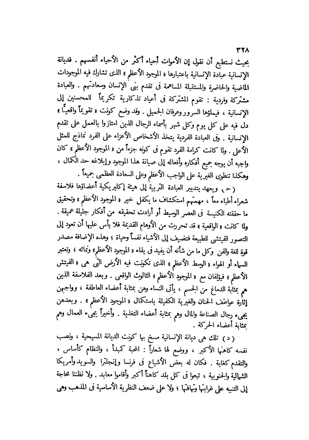 بحيث نستطيع أن نقول: إن الأموات أحياء أكثر من الأحياء أنفسهم. فديانة الإنسانية عبادة الإنسانية باعتبارها "الموجود الأعظم" الذي تشارك فيه الموجودات الماضية والحاضرة والمستقبلة المساهمة في تقدم بني الإنسان وسعادتهم. والعبادة مشتركة وفردية: تقوم المشتركة في أعياد تذكارية تكريمًا للمحسنين إلى الإنسانية، فيملؤها السرور وعرفان الجميل. وقد وضع كونت "تقويمًا واقعيًّا" دل فيه على كل يوم وكل شهر بأسماء الرجال الذين امتازوا بالعمل على تقدم الإنسانية. وفي العبادة الفردية يتخذ الأشخاص الأعزاء على الفرد نماذج للمثل الأعلى. ولما كانت كرامة الفرد تقوم في كونه جزءًا من "الموجود الأعظم" كان واجبه أن يوجه جميع أفكاره وأفعاله إلى صيانة هذا الموجود وإبلاغه حد الكمال، وهكذا تنطوي الغيرية على الواجب الأعظم, وعلى السعادة العظمى جميعًا.